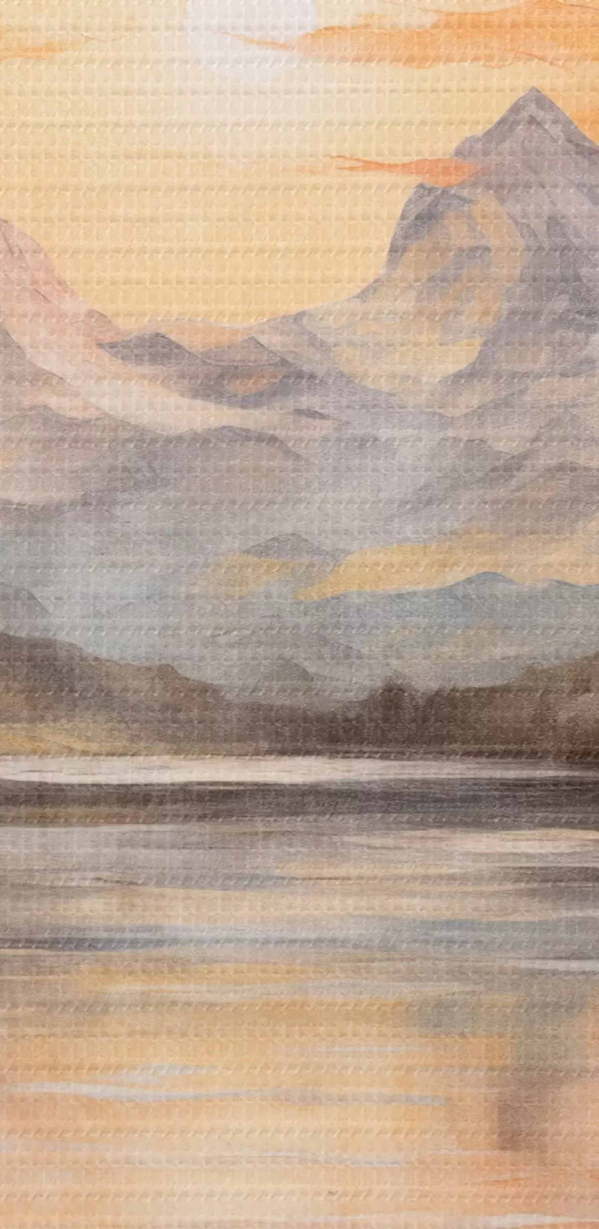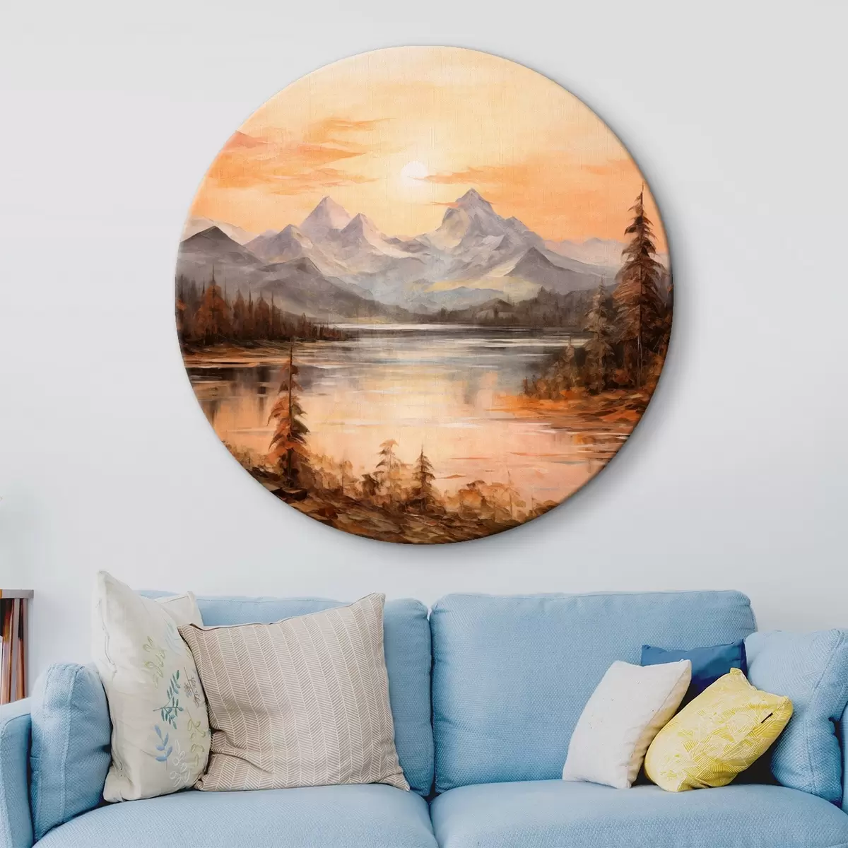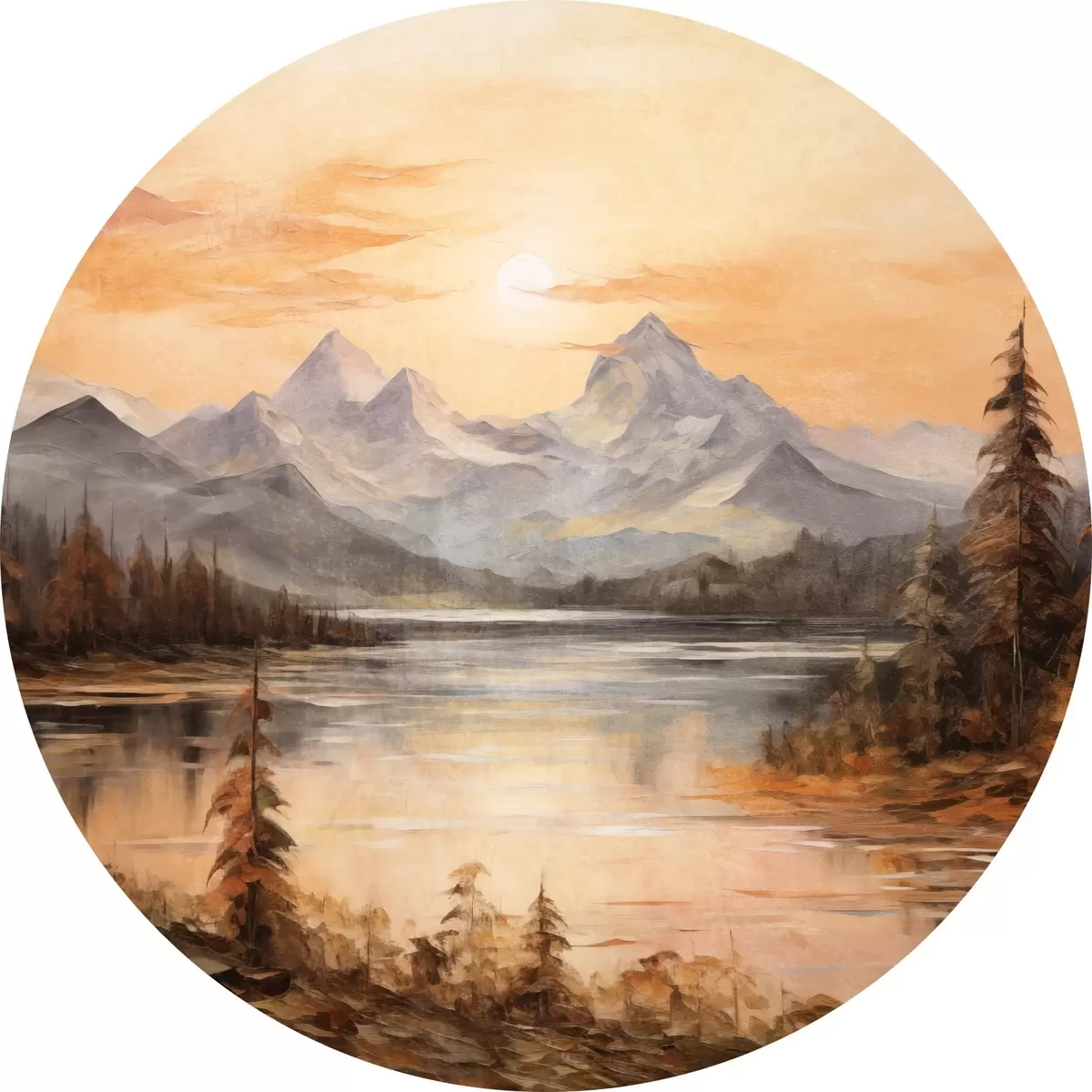 Obrázek Krajina s jezerem obklopeným stromy a horami v pozadí, oranžová obloha se sluncem Nr r44857