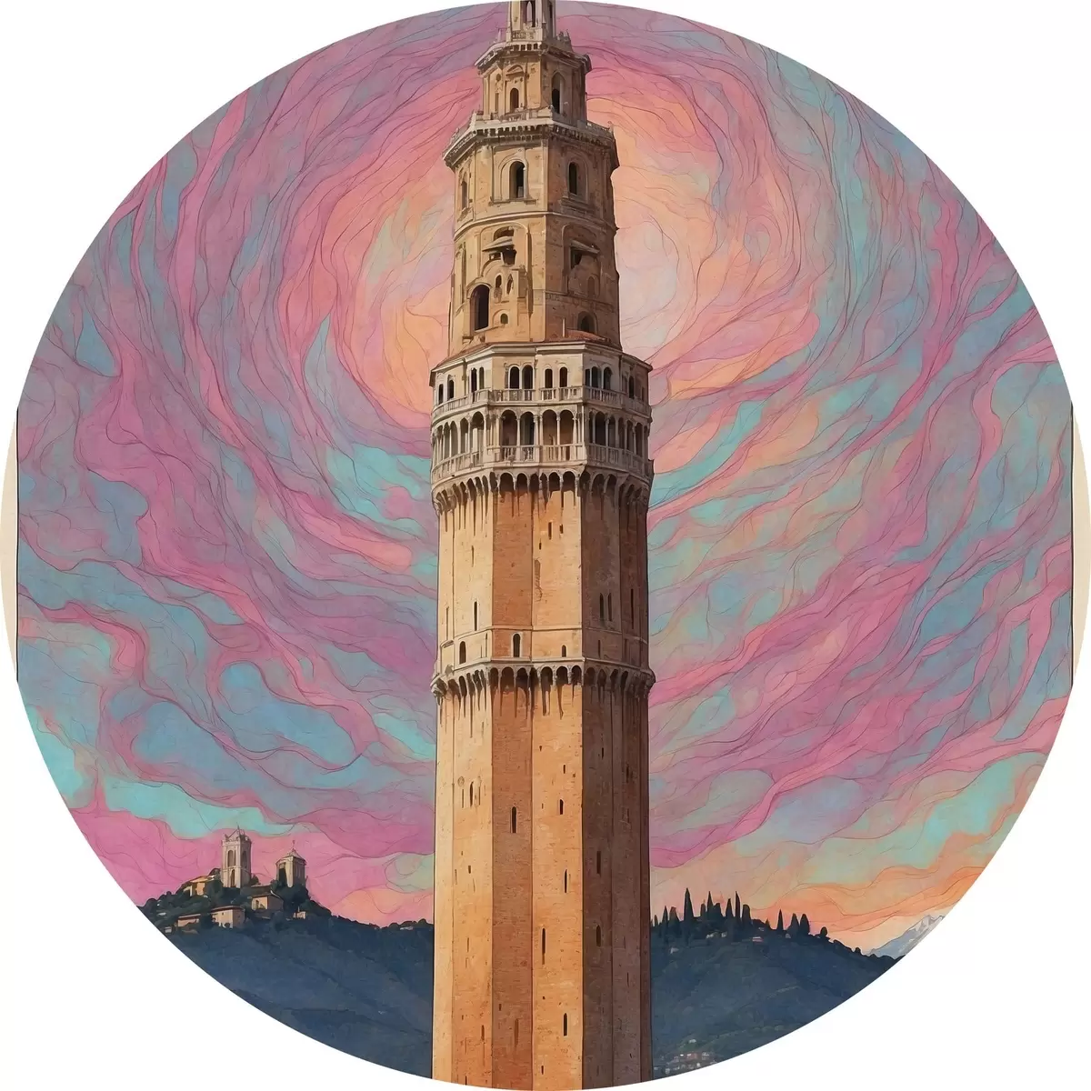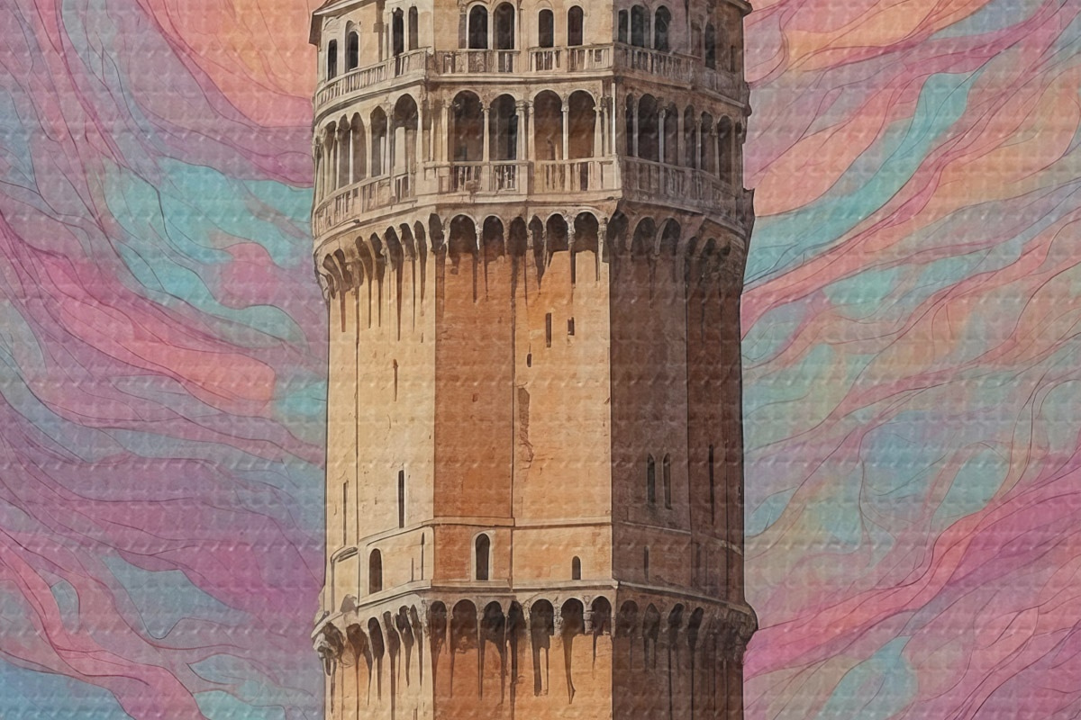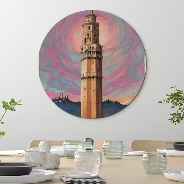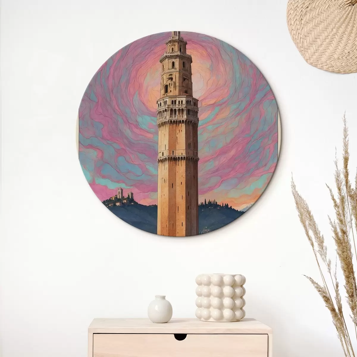 Obrázek Fantasy věž na pozadí oblohy s růžovými a modrými spirálami Nr r44885