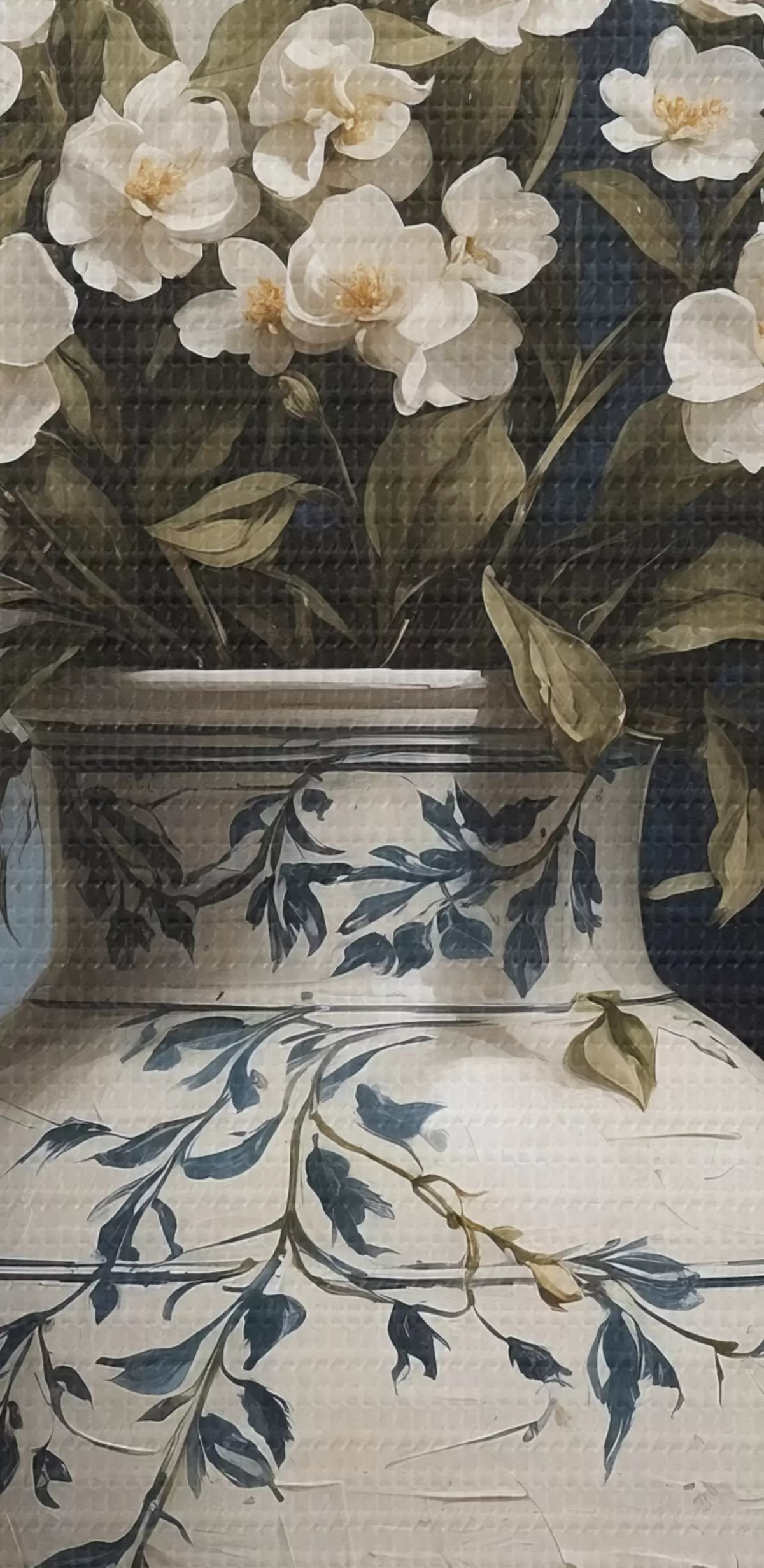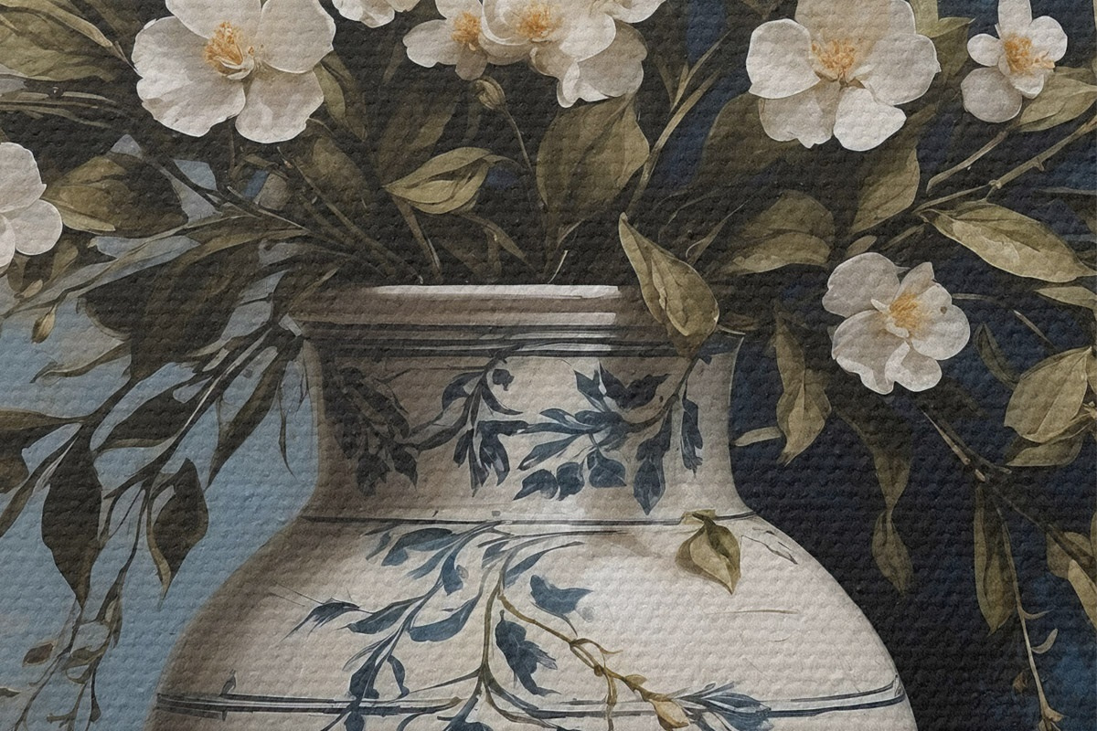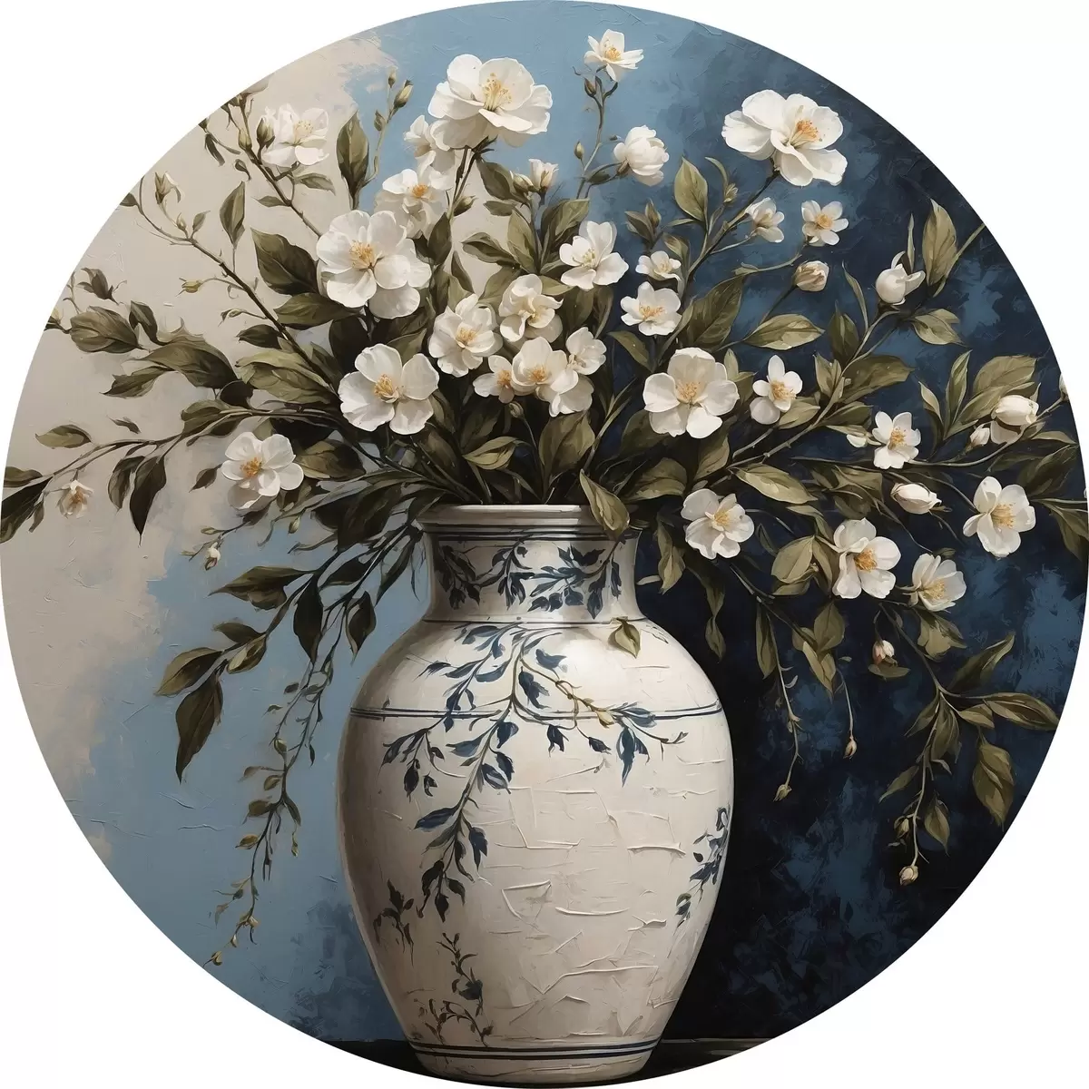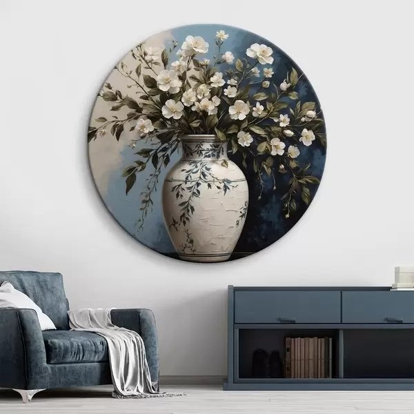 Obrázek Bílé a žluté květy ve velké váze na modrém pozadí Nr r44893