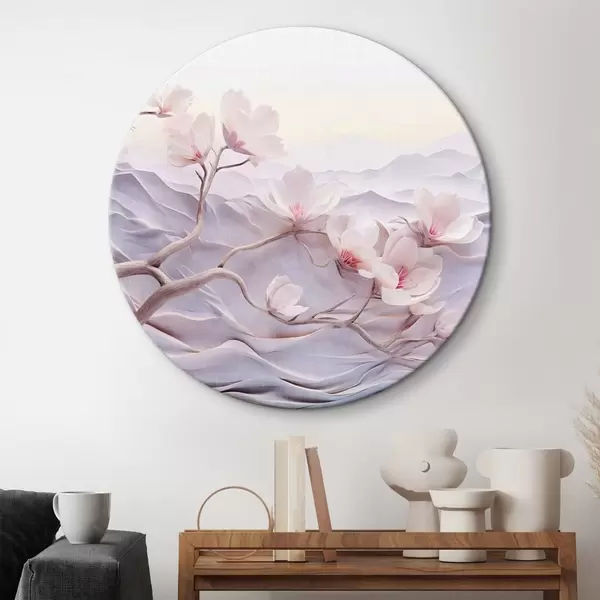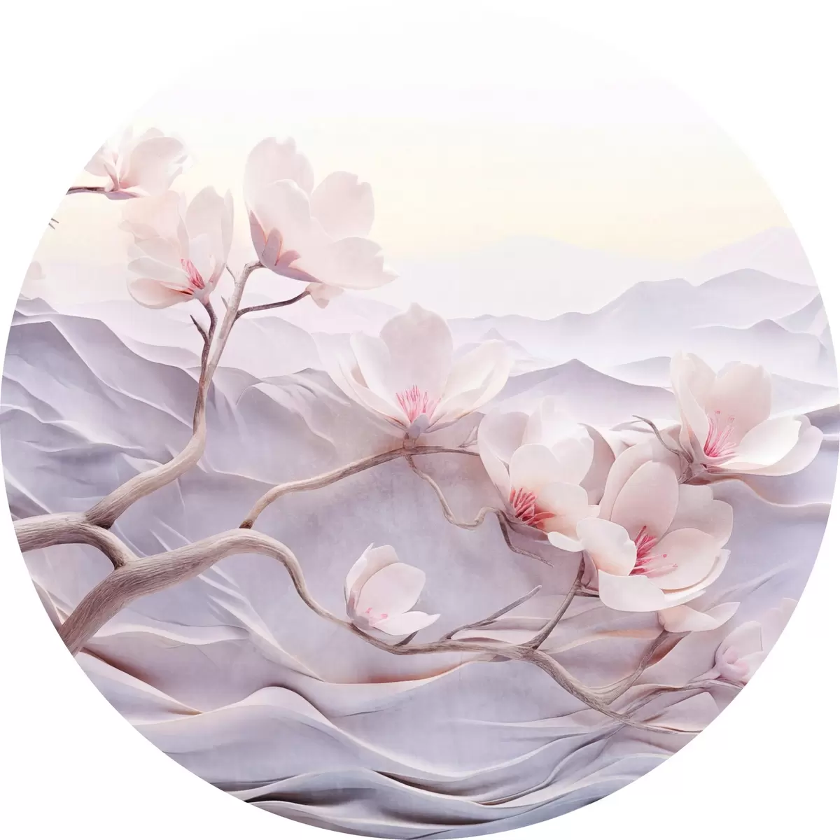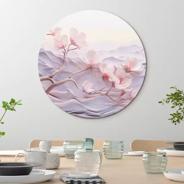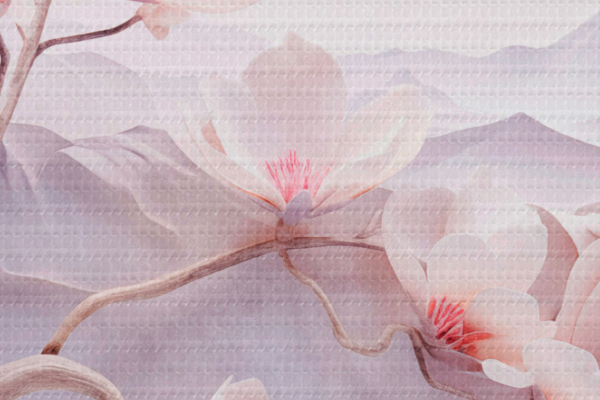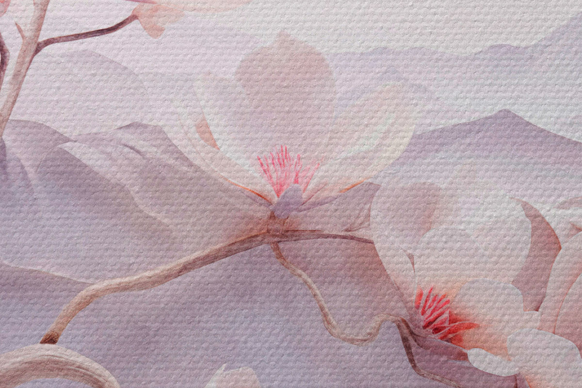 Obrázek Květinová větev s růžovými květy, hory v pozadí, jemné pastelové barvy, japonské umění s texturou Nr r44930
