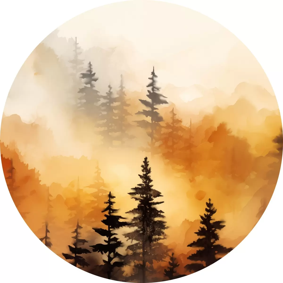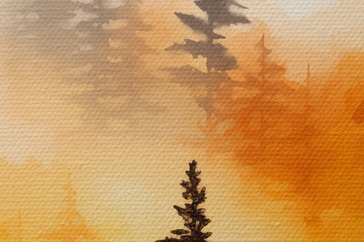 Obrázek Akvarelová malba krajiny imitující les s vysokými borovicemi a horami v pozadí Nr r45170