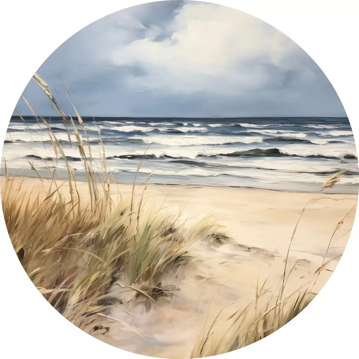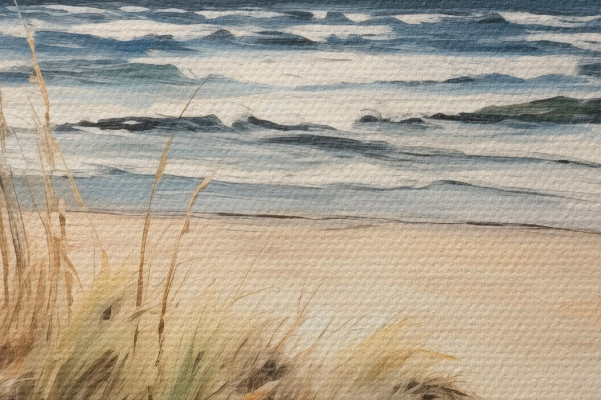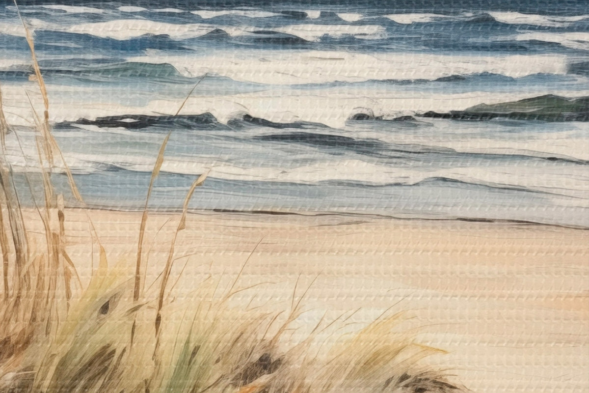 Obrázek Písečná pláž s vysokou trávou v popředí, oceán s vlnami a zataženou oblohou v pozadí Nr r45173