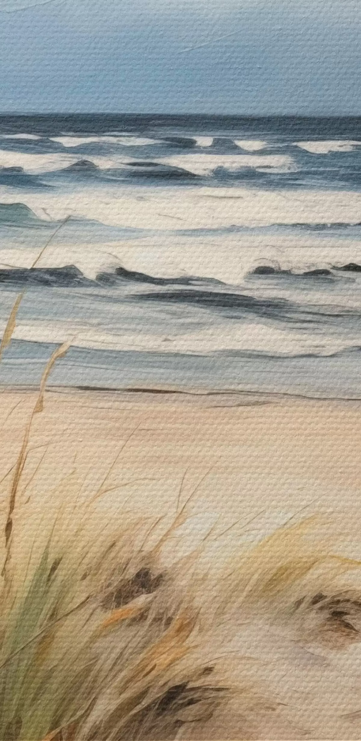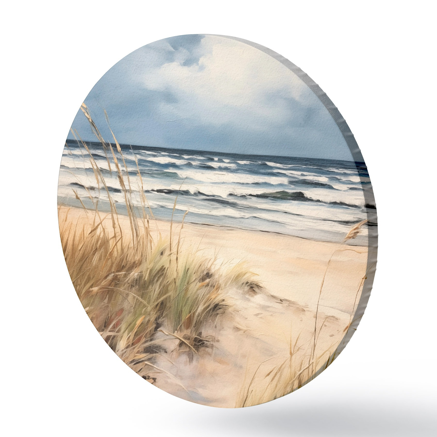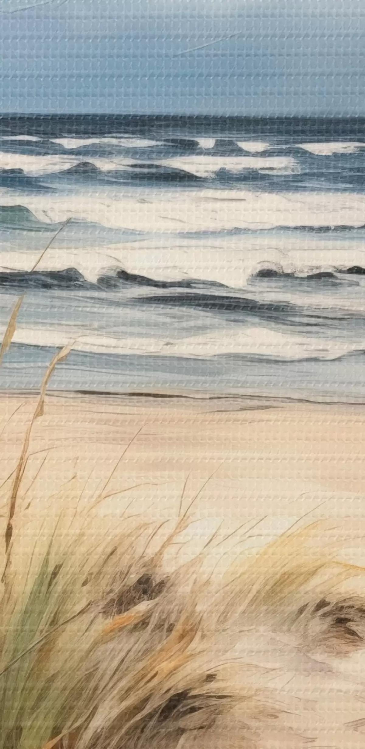 Obrázek Písečná pláž s vysokou trávou v popředí, oceán s vlnami a zataženou oblohou v pozadí Nr r45173