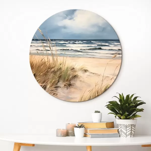 Kulaté obrazy Písečná pláž s vysokou trávou v popředí, oceán s vlnami a zataženou oblohou v pozadí r45173