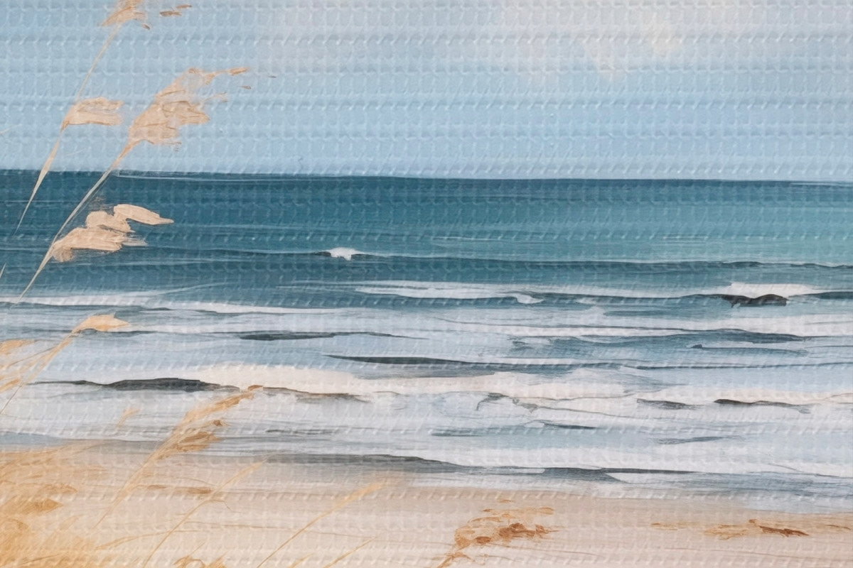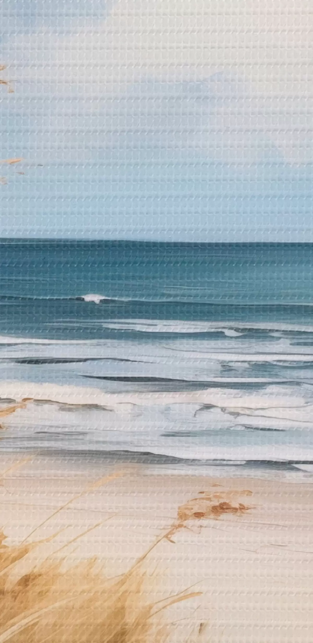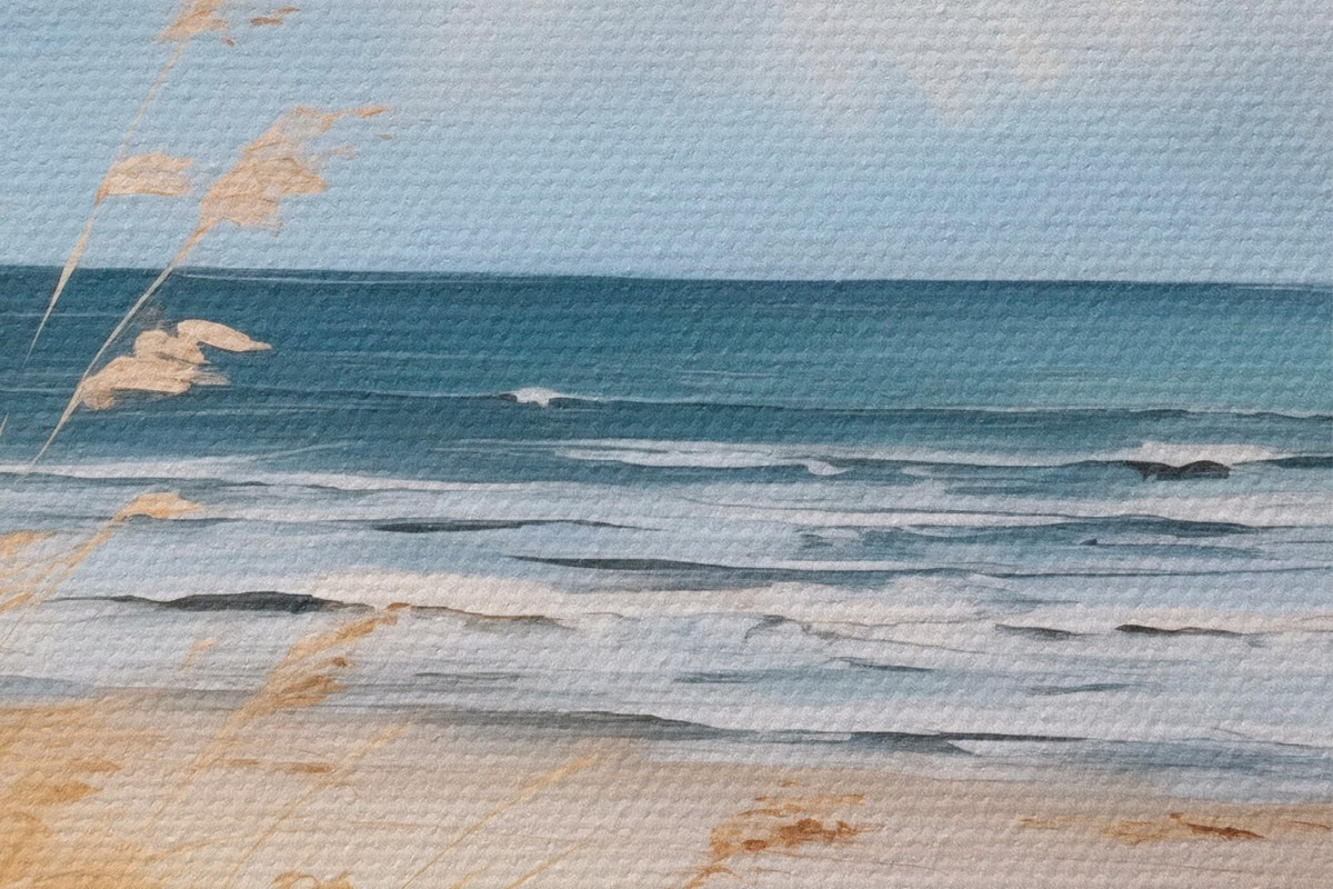 Obrázek Písečná pláž s vysokou trávou v popředí, oceán s vlnami a zataženou oblohou v pozadí Nr r45174