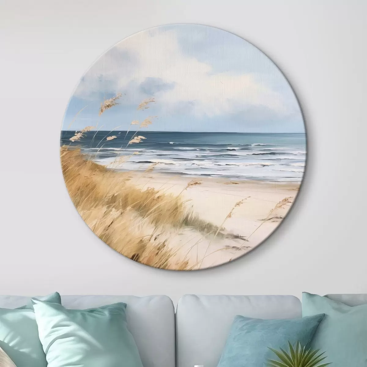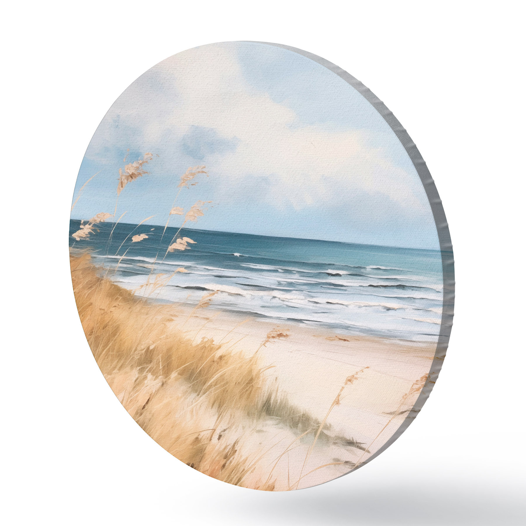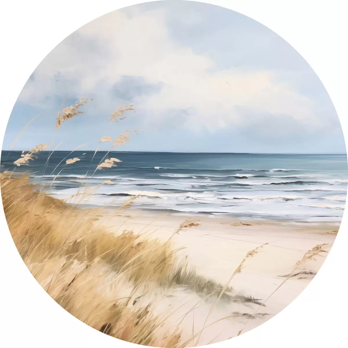 Obrázek Písečná pláž s vysokou trávou v popředí, oceán s vlnami a zataženou oblohou v pozadí Nr r45174