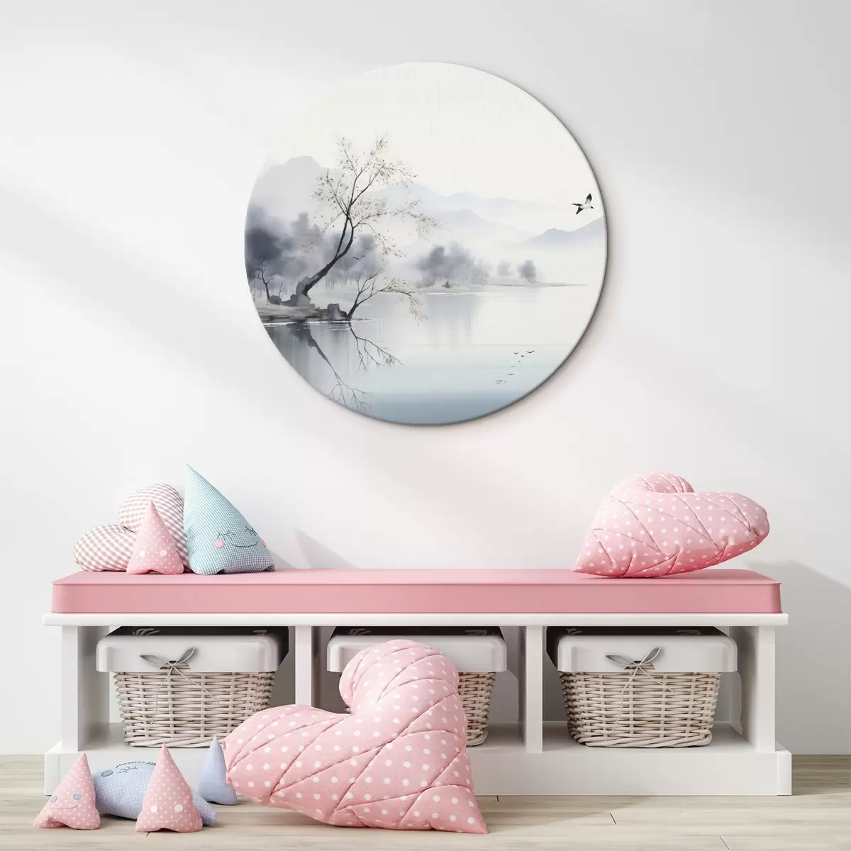 Obrázek Mlžná krajina se stromem, horami a ptáky Nr r45518