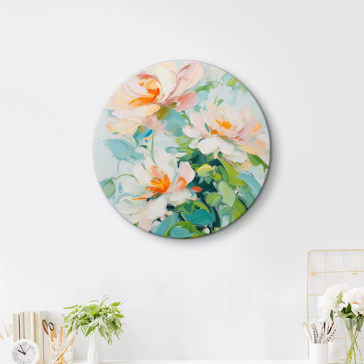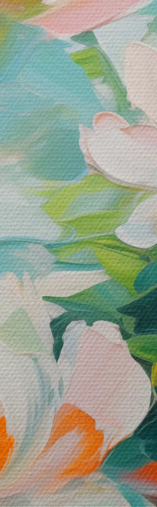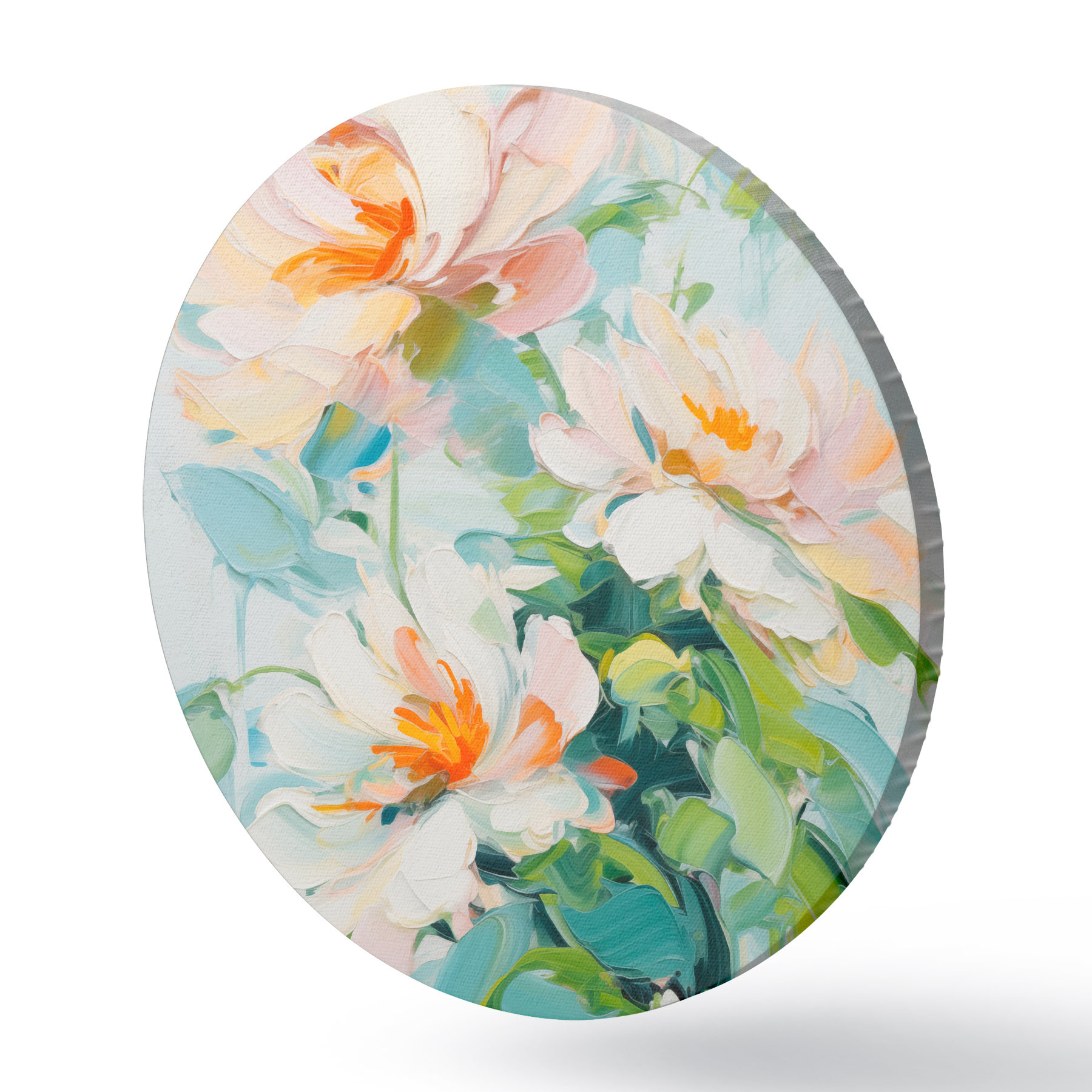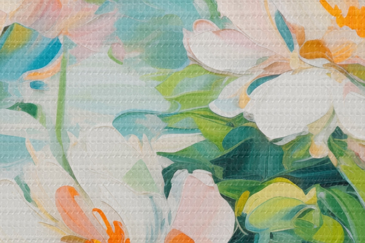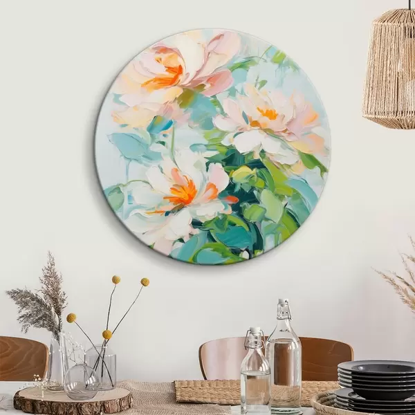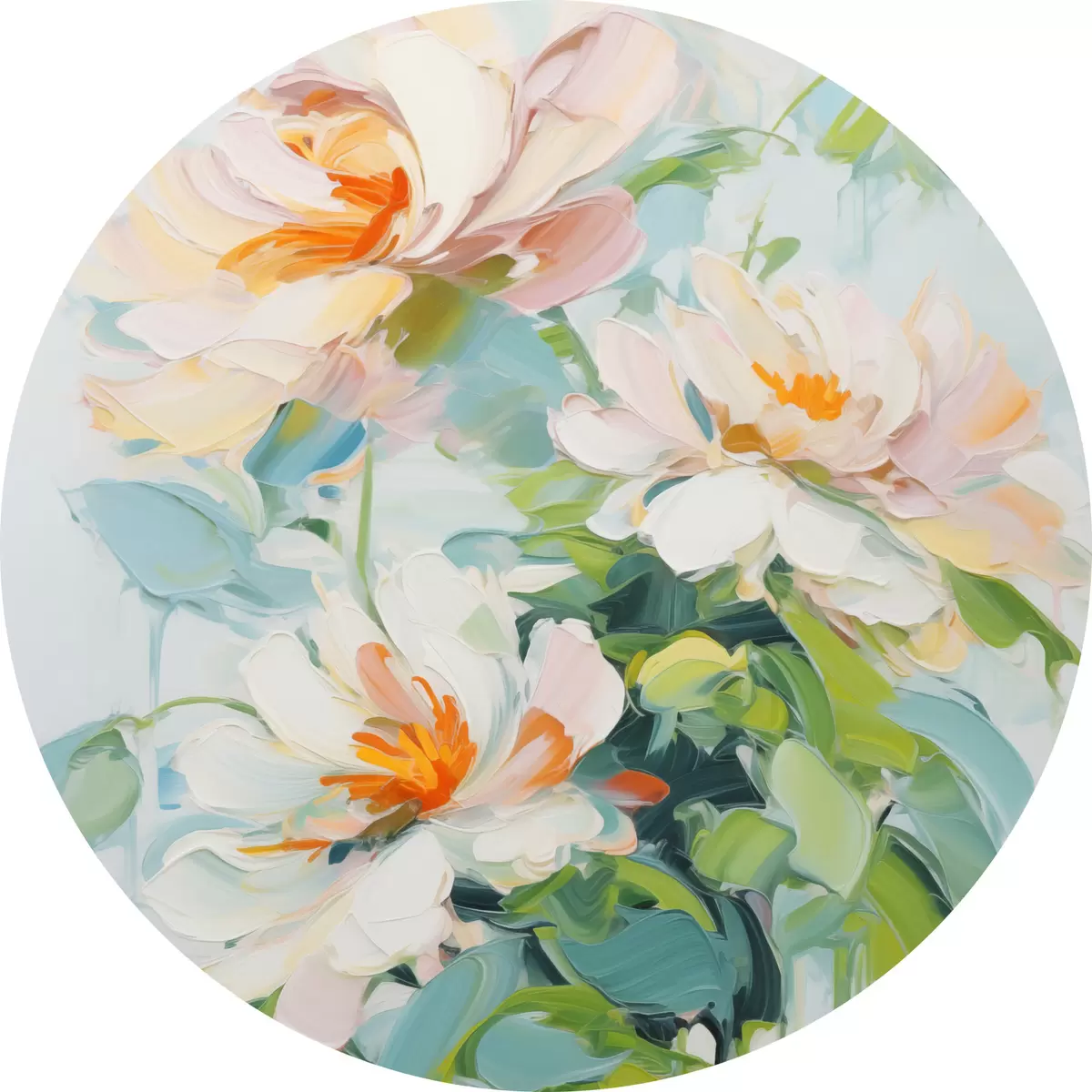 Obrázek Bílé a pastelové broskvové květy, zelené listy, jemné tahy štětcem imitace olejomalby, světle modré pozadí Nr r45550