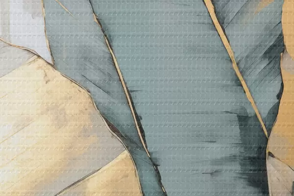 Obrázek Tlumené modré, šedé a žluté banánové listy s viditelnými tahy štětce na bílém abstraktním pozadí Nr r45552