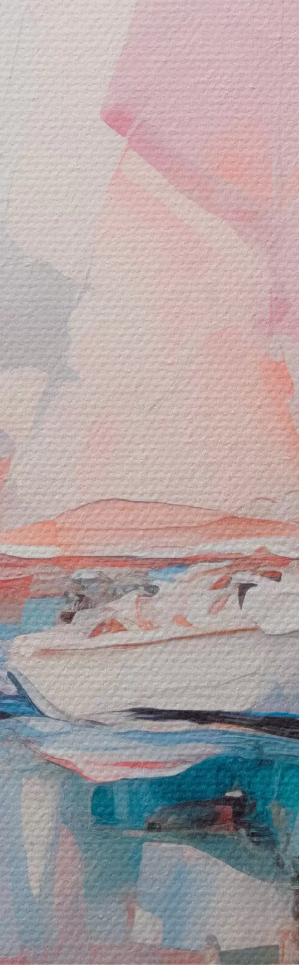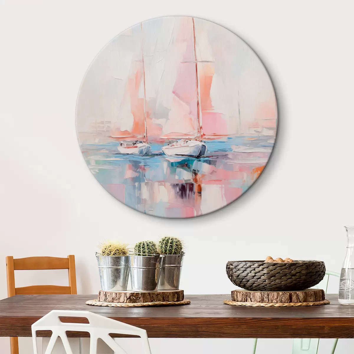 Obrázek Plachetnice s růžovými plachtami plující na klidném moři, odrazy lodí ve vodě, jemné pastelové barvy Nr r45557