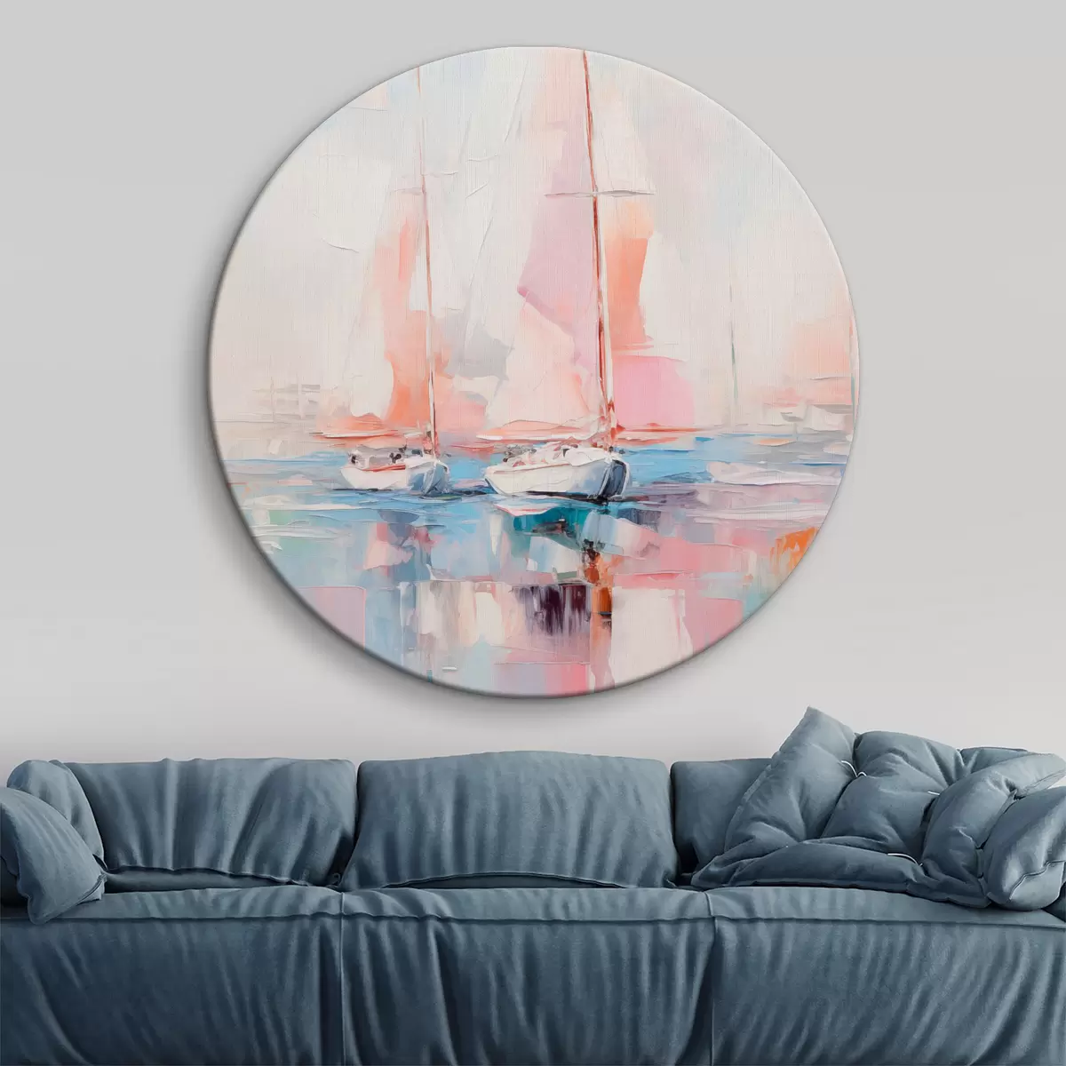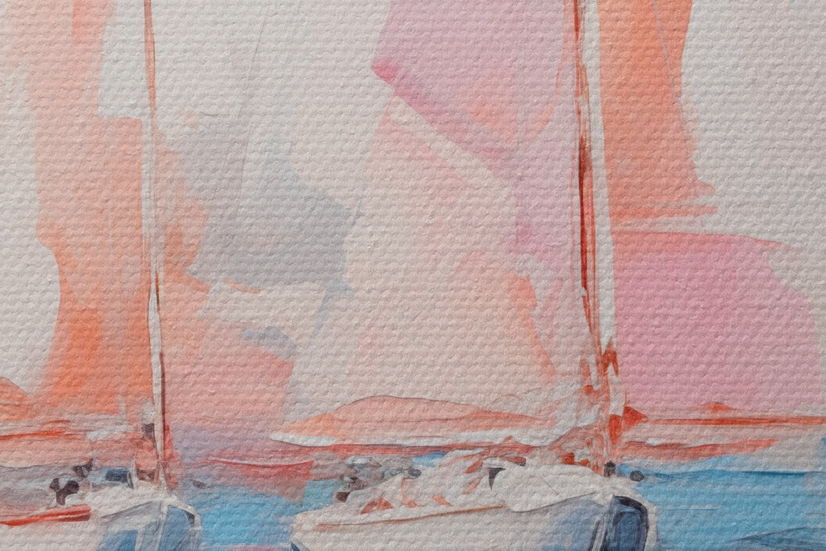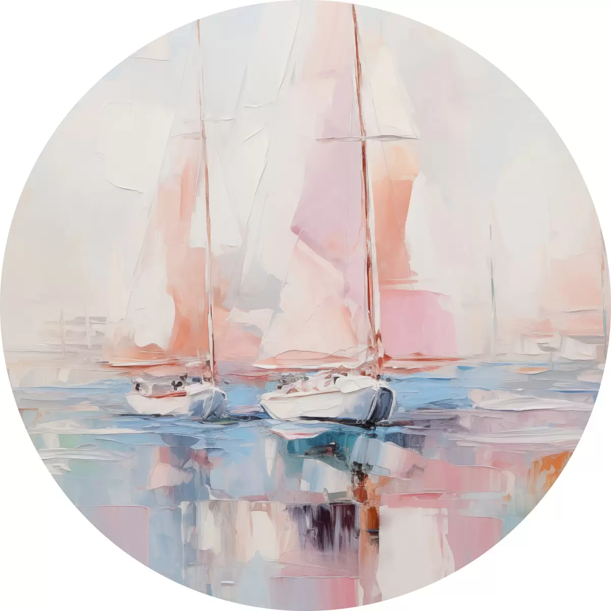 Obrázek Plachetnice s růžovými plachtami plující na klidném moři, odrazy lodí ve vodě, jemné pastelové barvy Nr r45557