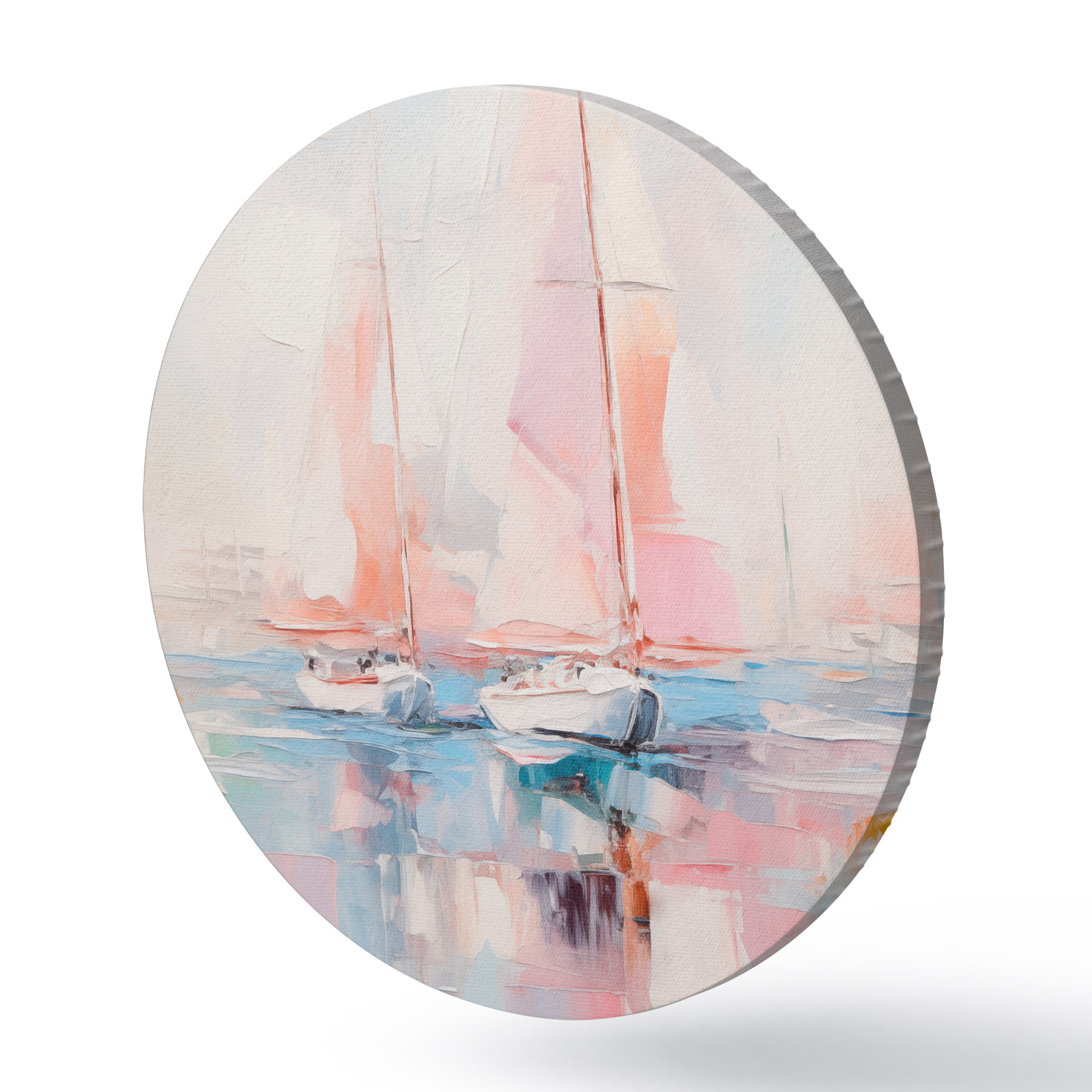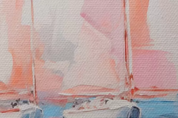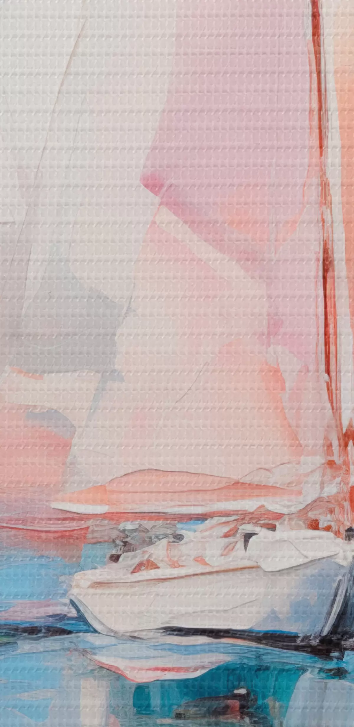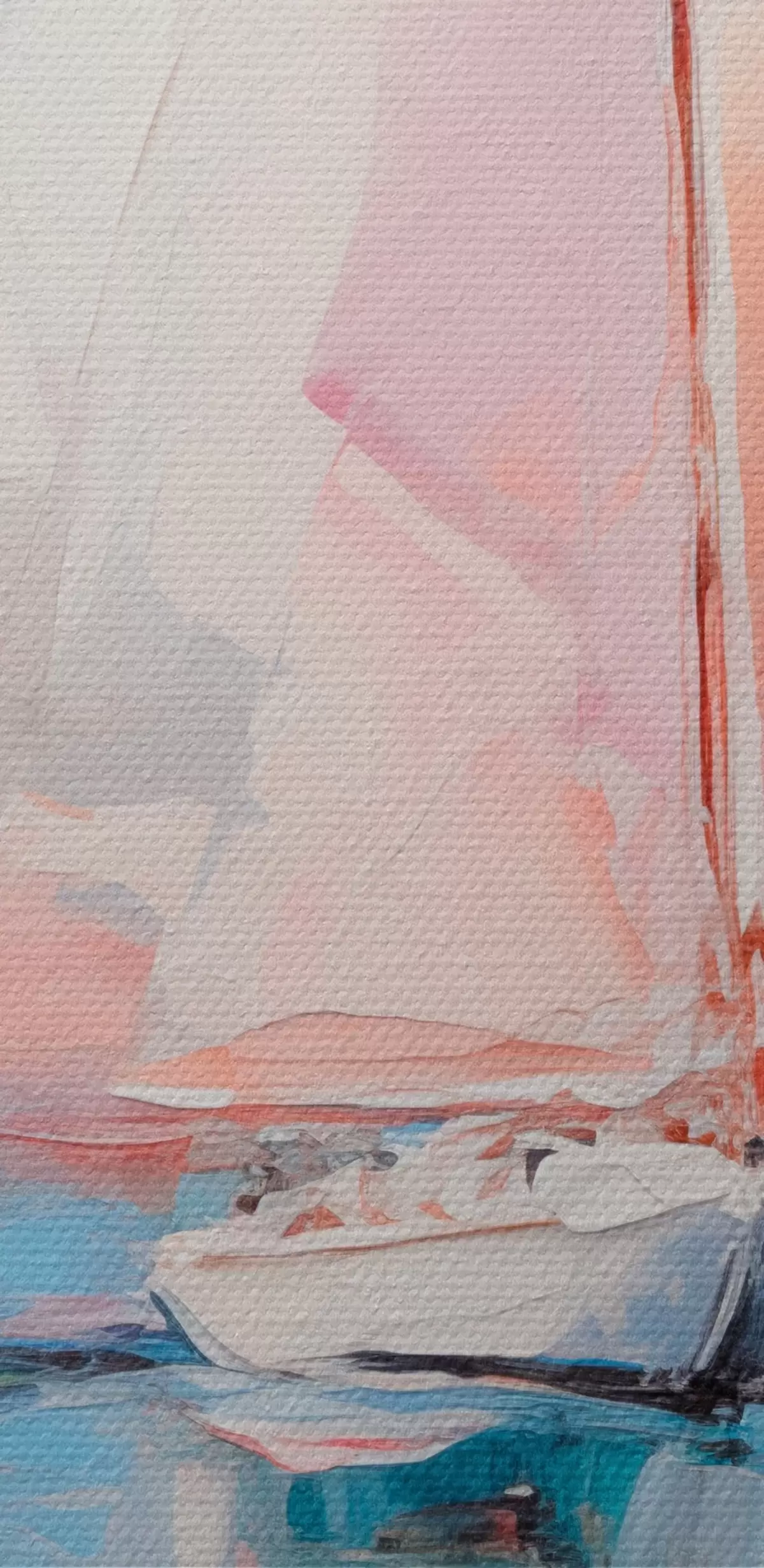 Obrázek Plachetnice s růžovými plachtami plující na klidném moři, odrazy lodí ve vodě, jemné pastelové barvy Nr r45557