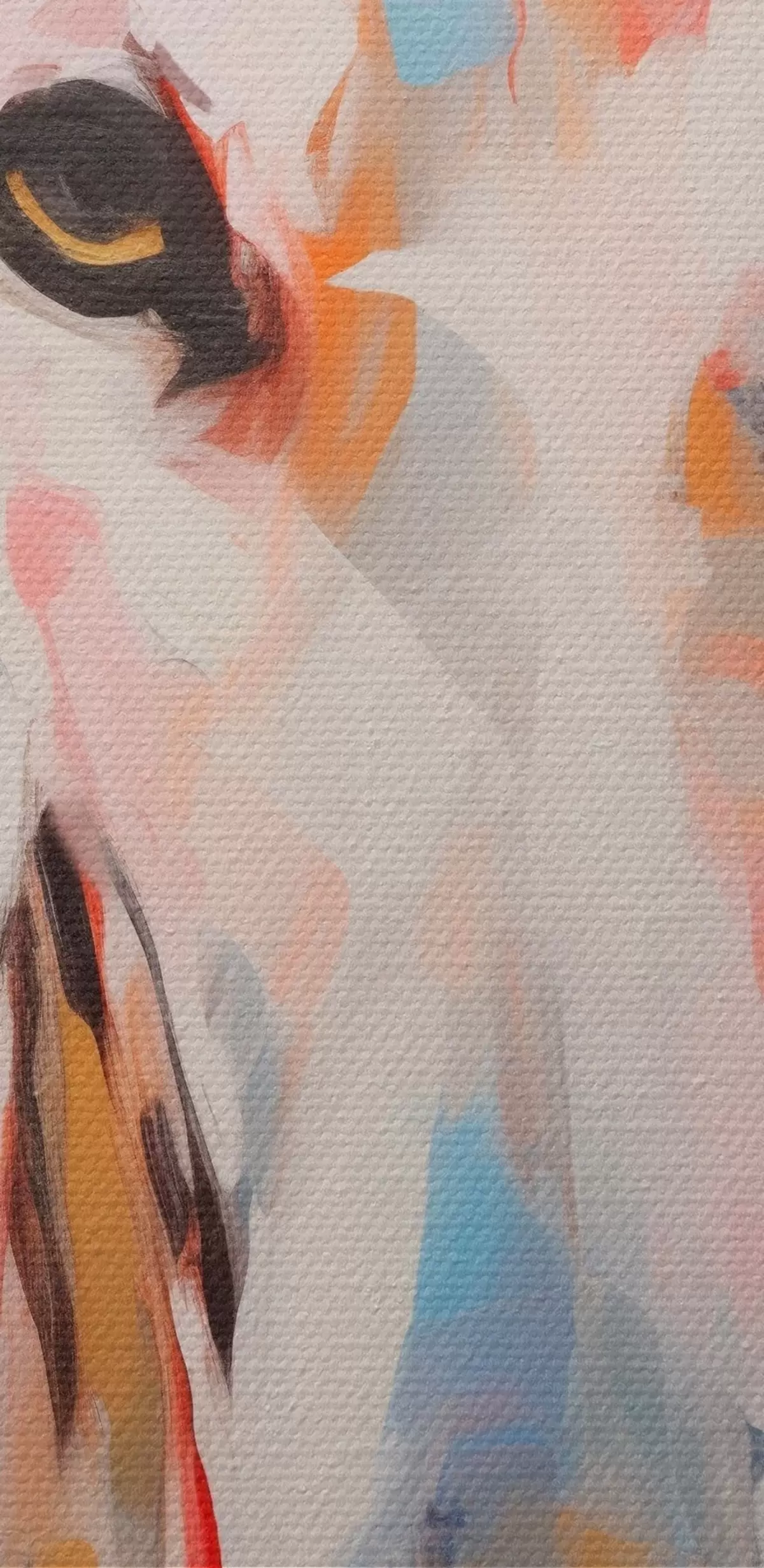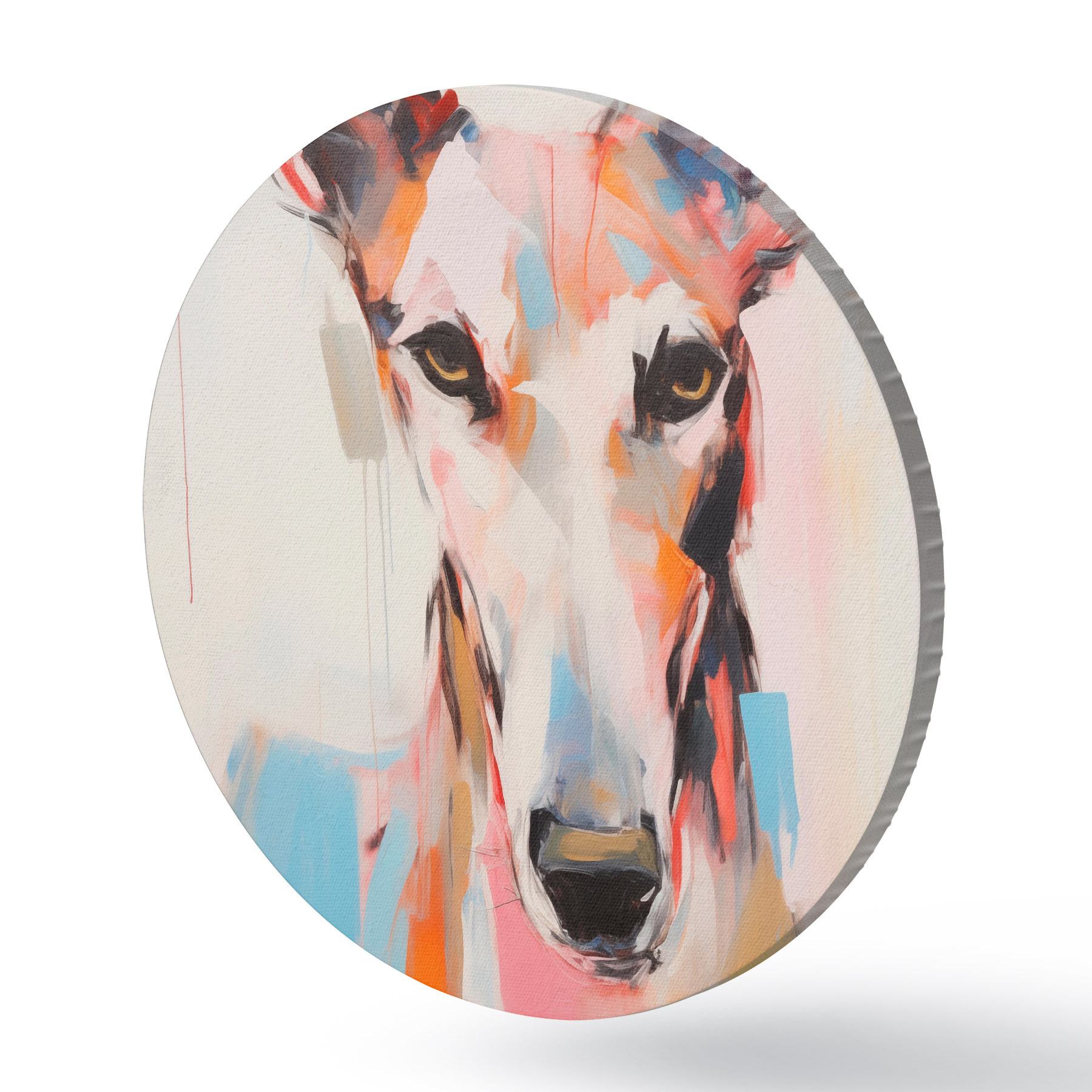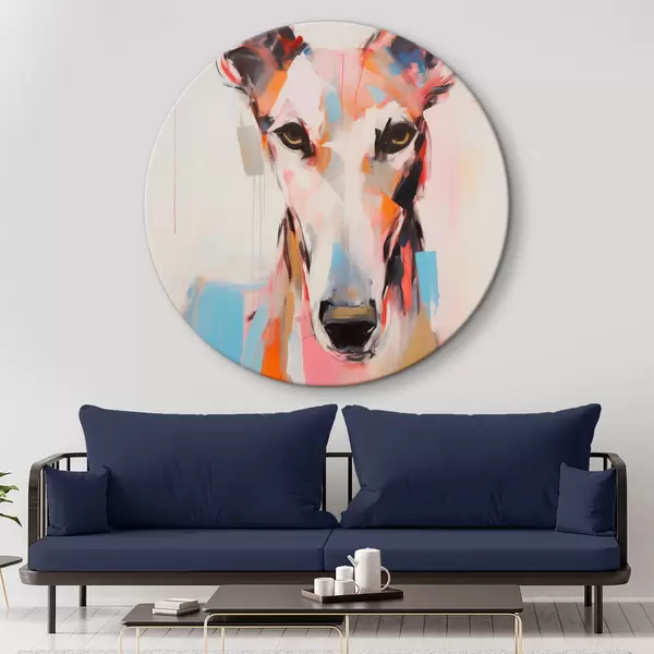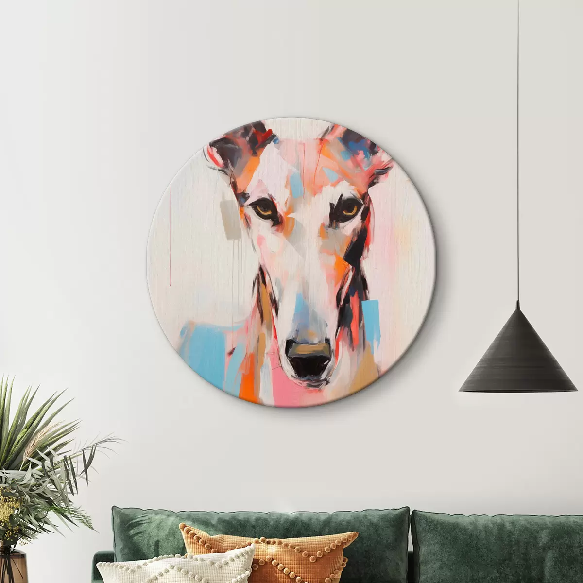Obrázek Chrtí pes namalovaný v zářivých barvách, jako je oranžová, růžová a modrá, na obyčejném bílém pozadí Nr r45565
