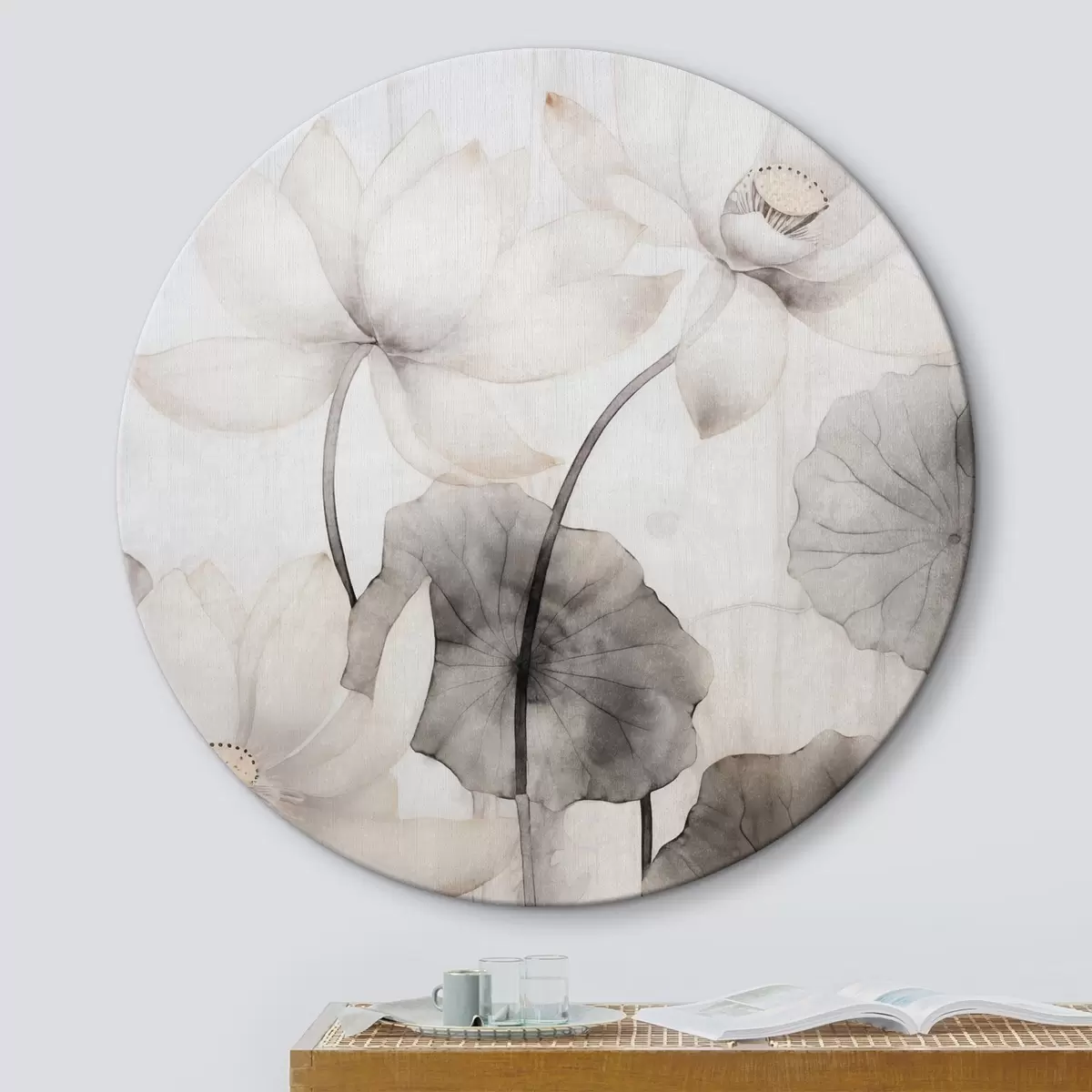 Obrázek Bílé texturované lotosové květy s tmavými listy, světlé pozadí, minimalistický design Nr r45937