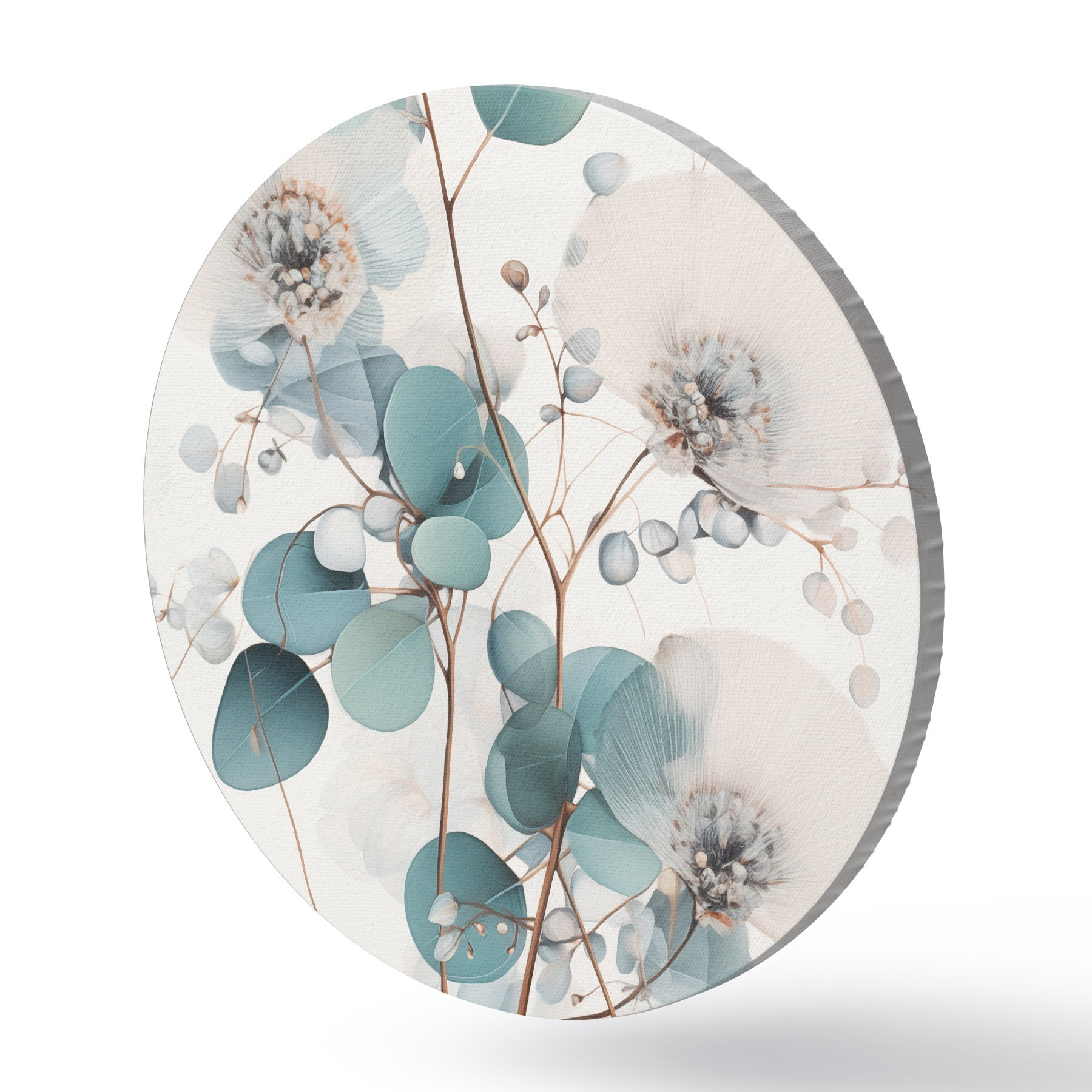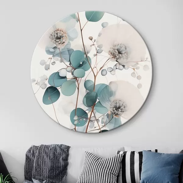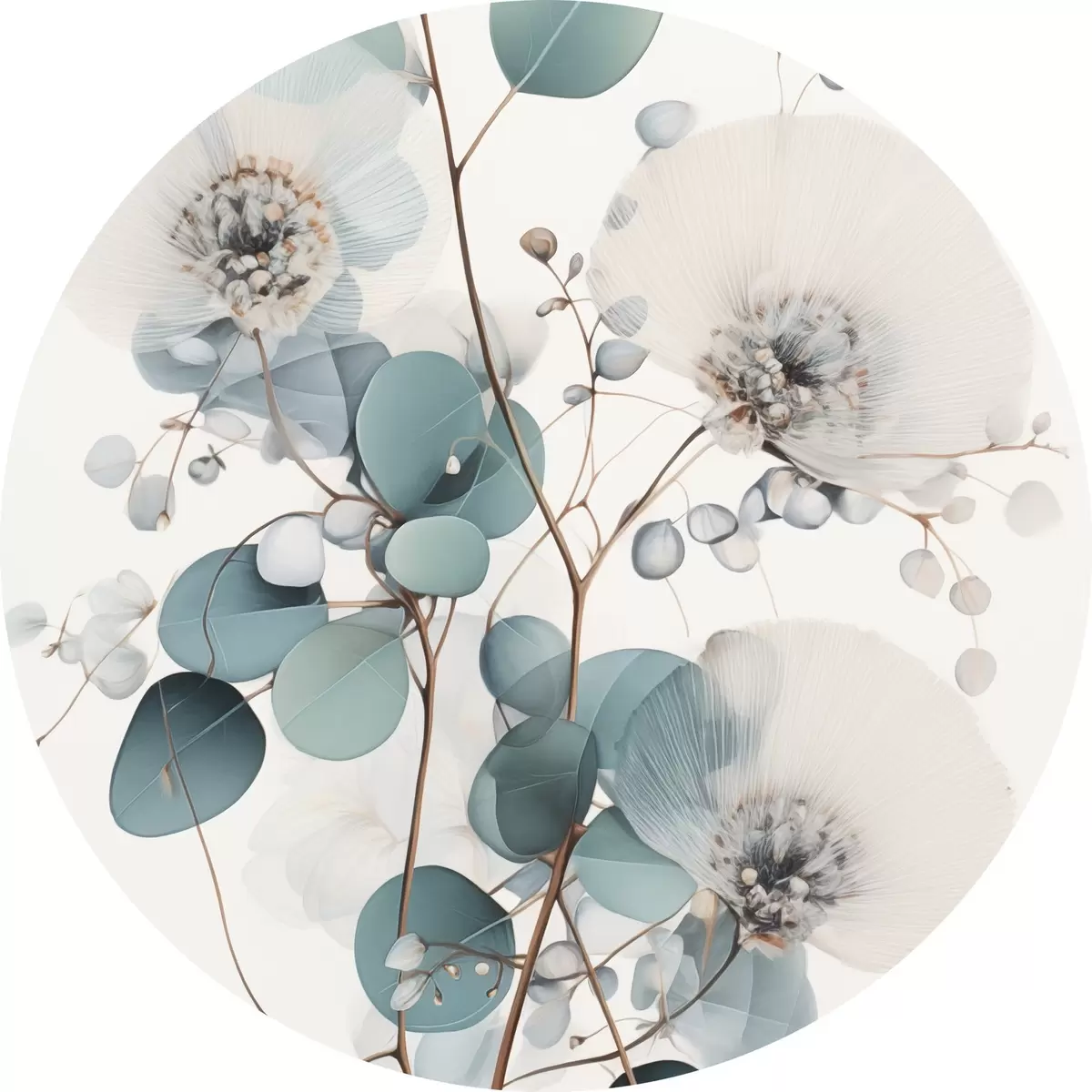 Kulaté obrazy Abstraktní květy eukalyptu s bílými okvětními lístky, tlumeně zelené listy na větvích r45946