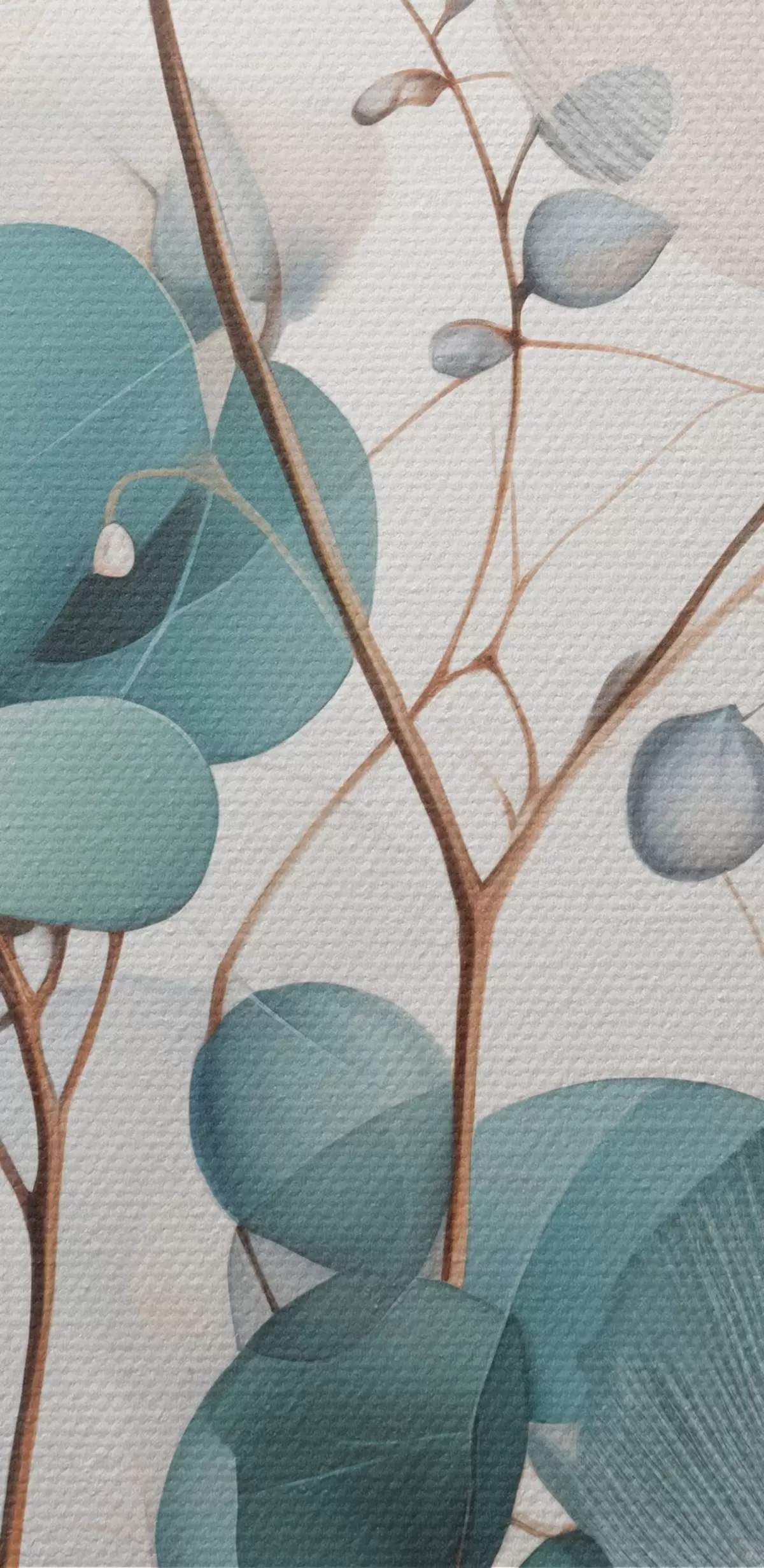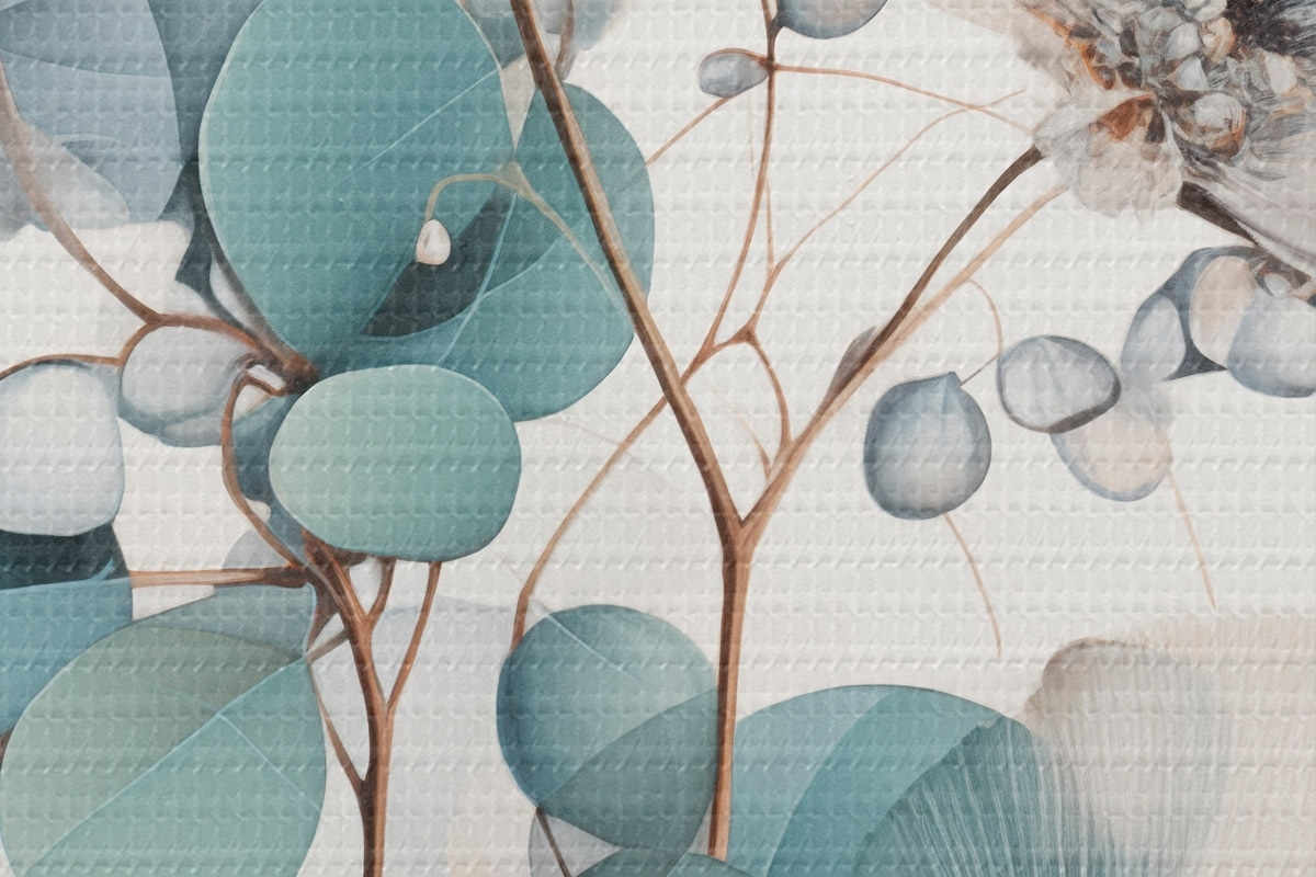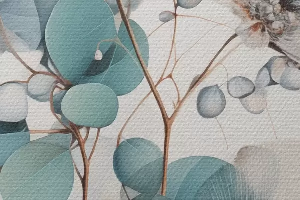 Obrázek Abstraktní květy eukalyptu s bílými okvětními lístky, tlumeně zelené listy na větvích Nr r45946