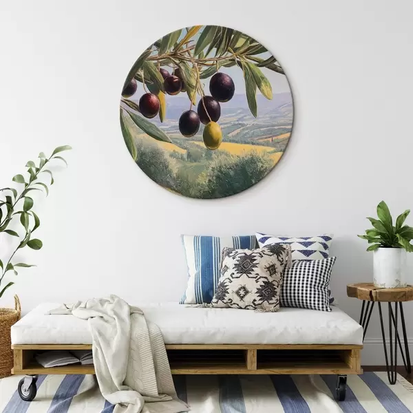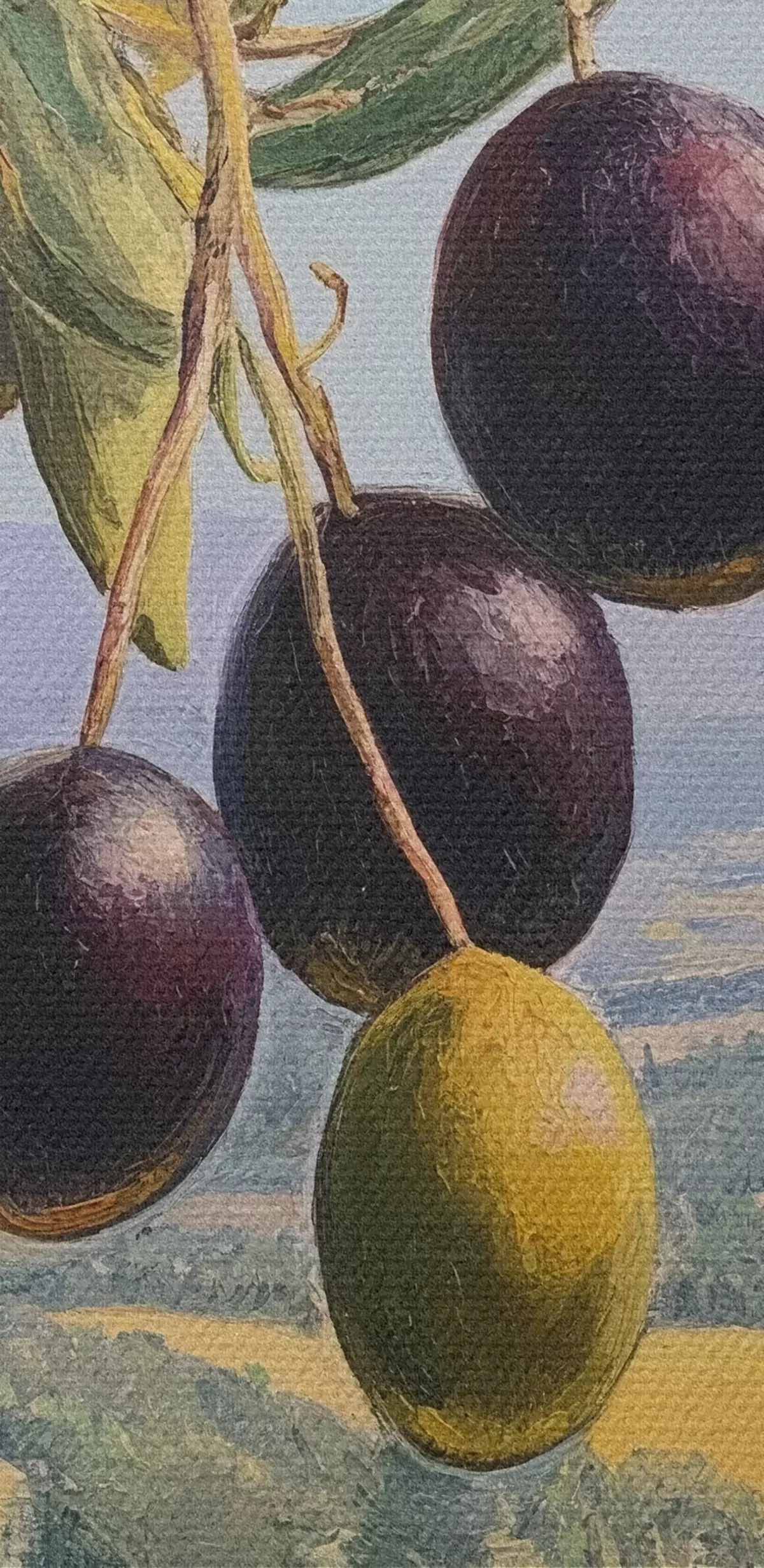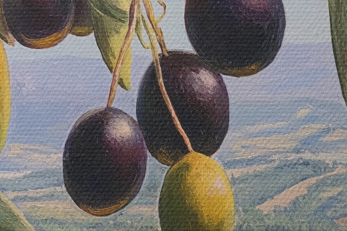 Obrázek Olivová ratolest s tmavými plody na pozadí letní krajiny Nr r46150