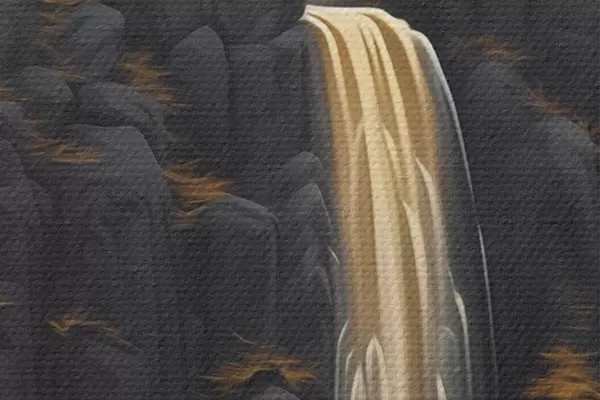 Obrázek Skalnatá krajina s vodopádem v teplých barvách západu slunce Nr r46177