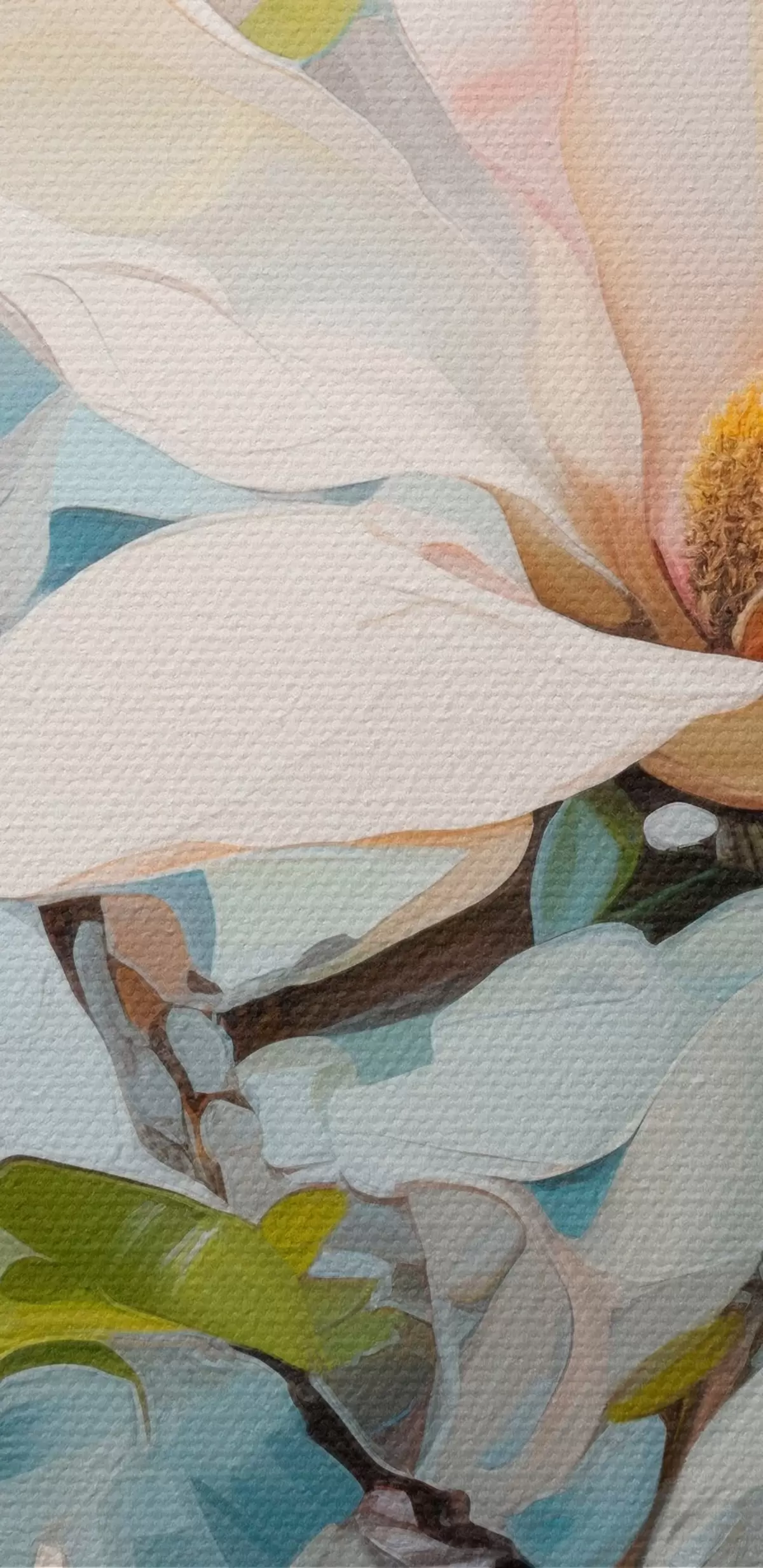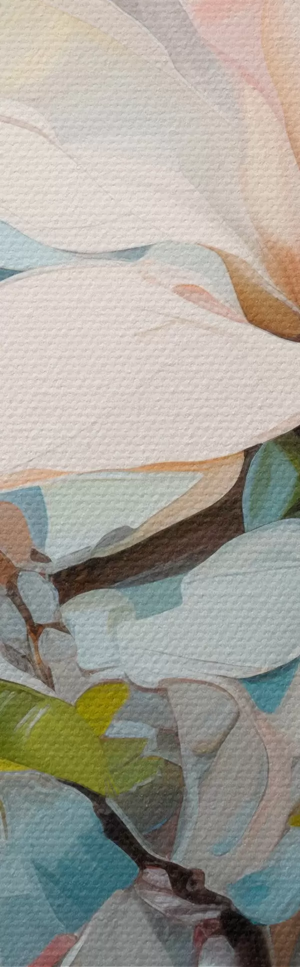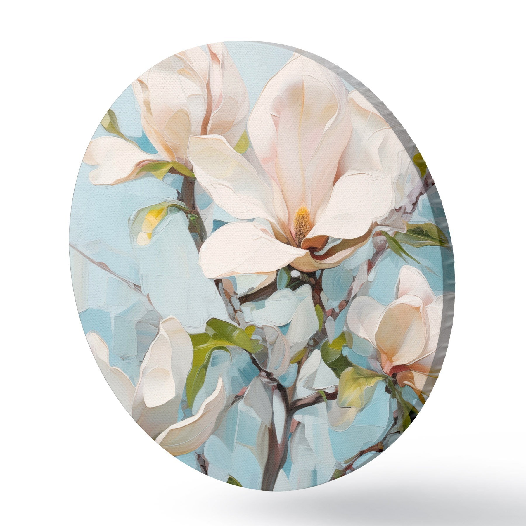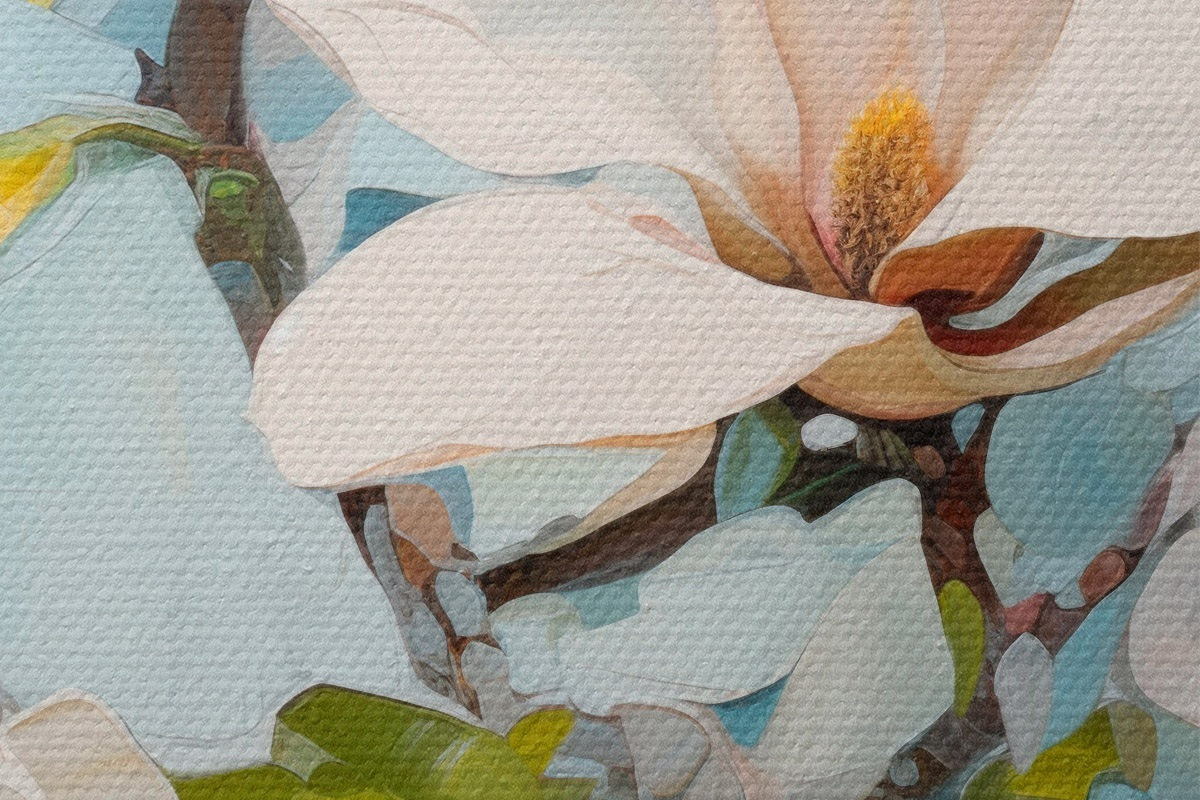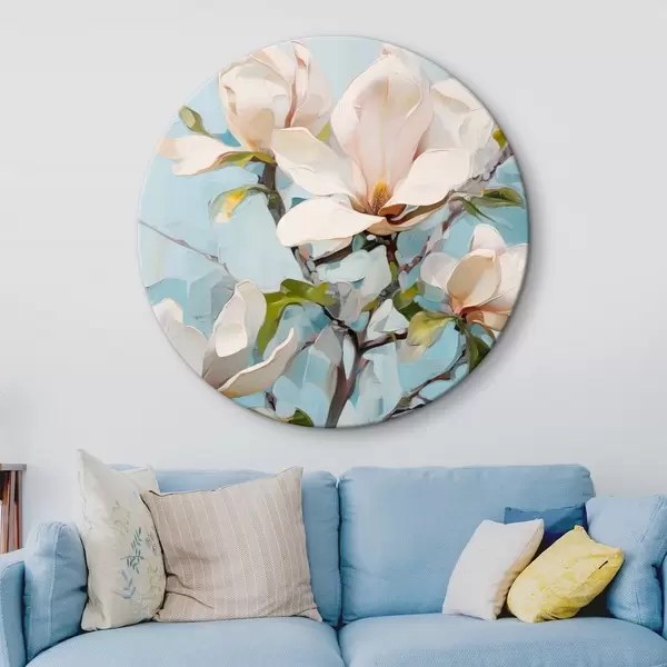 Obrázek Bílé květy magnólie, světle modré pozadí s jemnými tahy štětcem, styl olejomalby, impasto textura Nr r46277