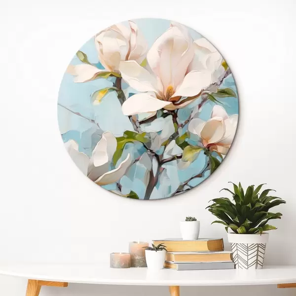 Obrázek Bílé květy magnólie, světle modré pozadí s jemnými tahy štětcem, styl olejomalby, impasto textura Nr r46277