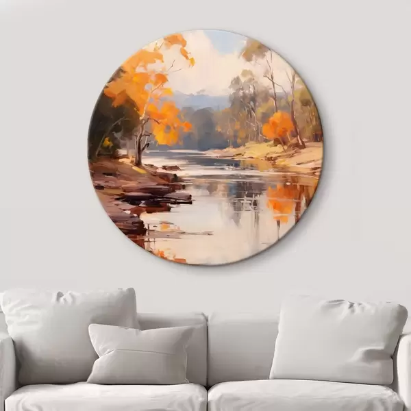 Obrázek Podzimní krajina, řeka s stromy na břehu, les v pozadí, odrazy na vodě Nr r46280