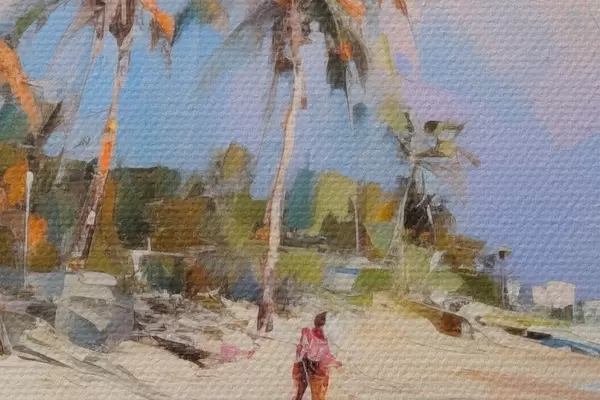 Obrázek Abstraktní krajina, pláž s palmami, jasný slunečný den s modrou oblohou a několika mraky Nr r46284
