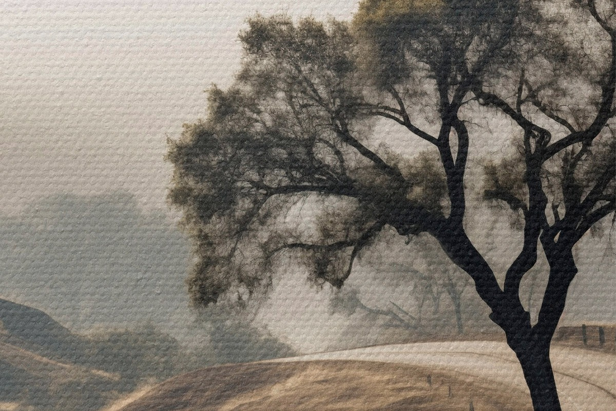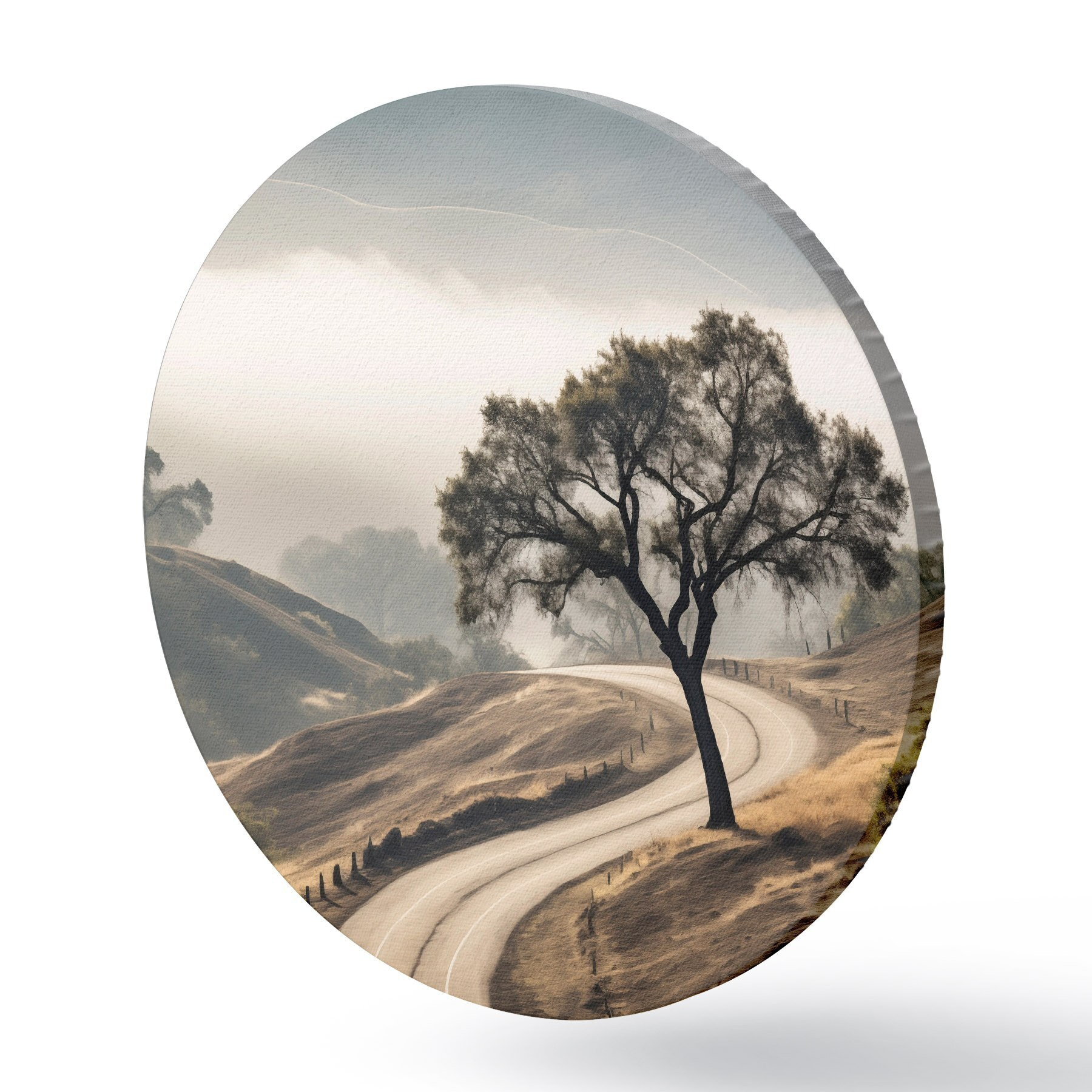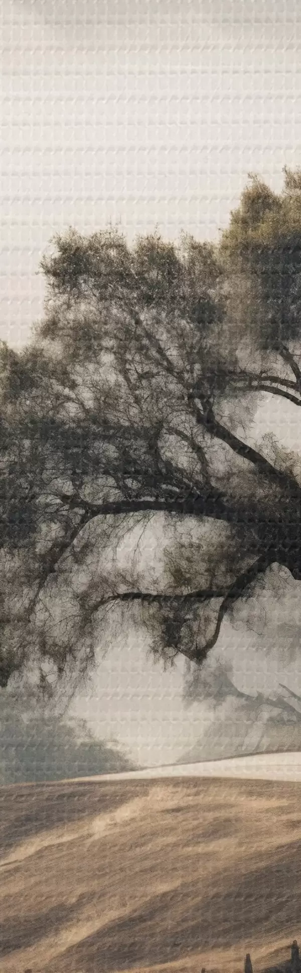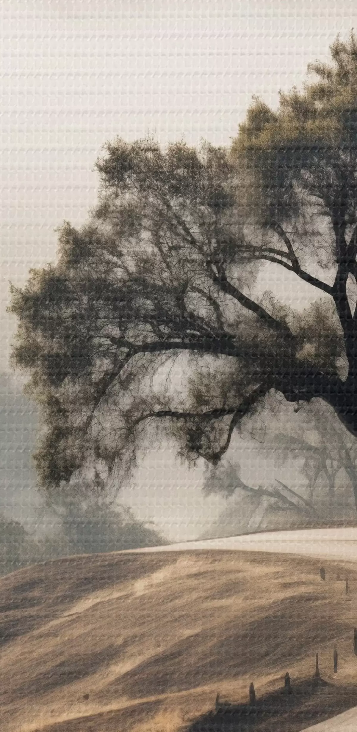 Obrázek Klikatá silnice vedoucí přes zvlněné kopce s stromem v popředí, pozadí s mlhou a horami Nr r46288