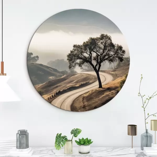 Obrázek Klikatá silnice vedoucí přes zvlněné kopce s stromem v popředí, pozadí s mlhou a horami Nr r46288