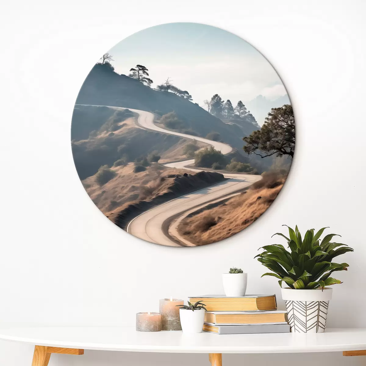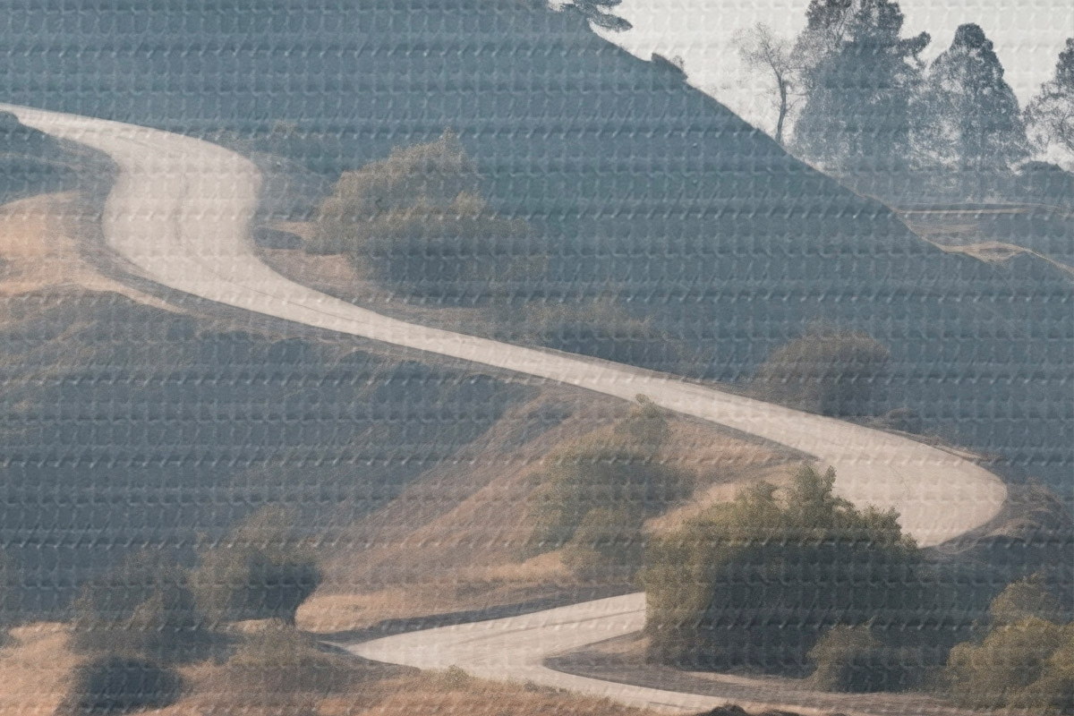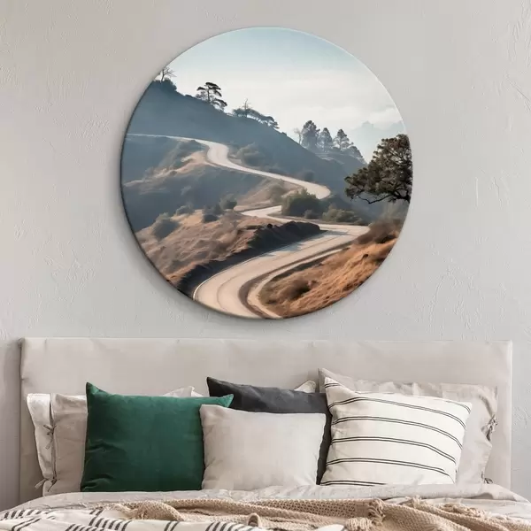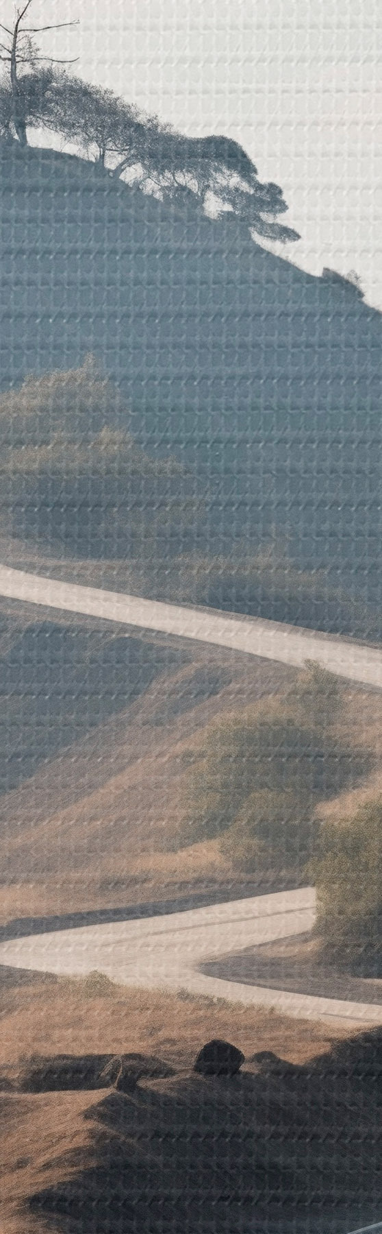 Obrázek Klikatá silnice vedoucí kopcovitou krajinou s suchou trávou pod jasnou oblohou a horami v dálce Nr r46289