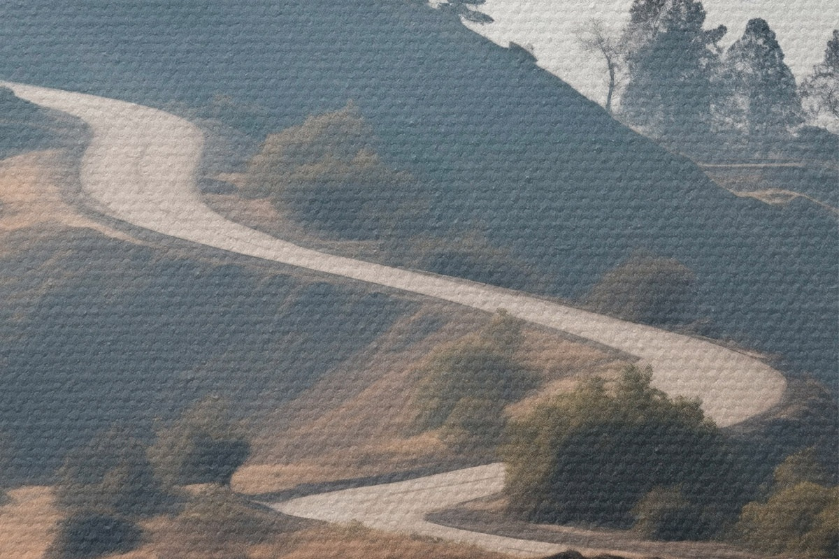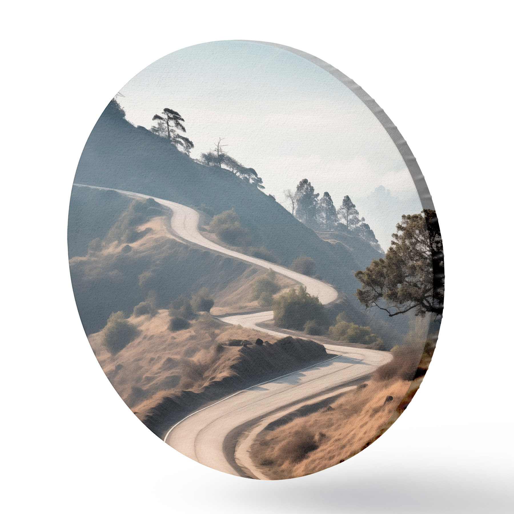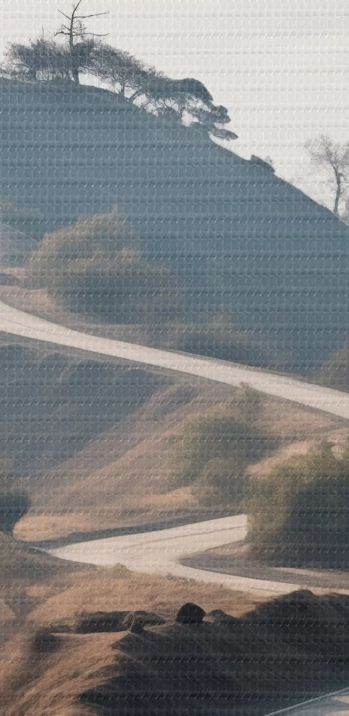 Obrázek Klikatá silnice vedoucí kopcovitou krajinou s suchou trávou pod jasnou oblohou a horami v dálce Nr r46289
