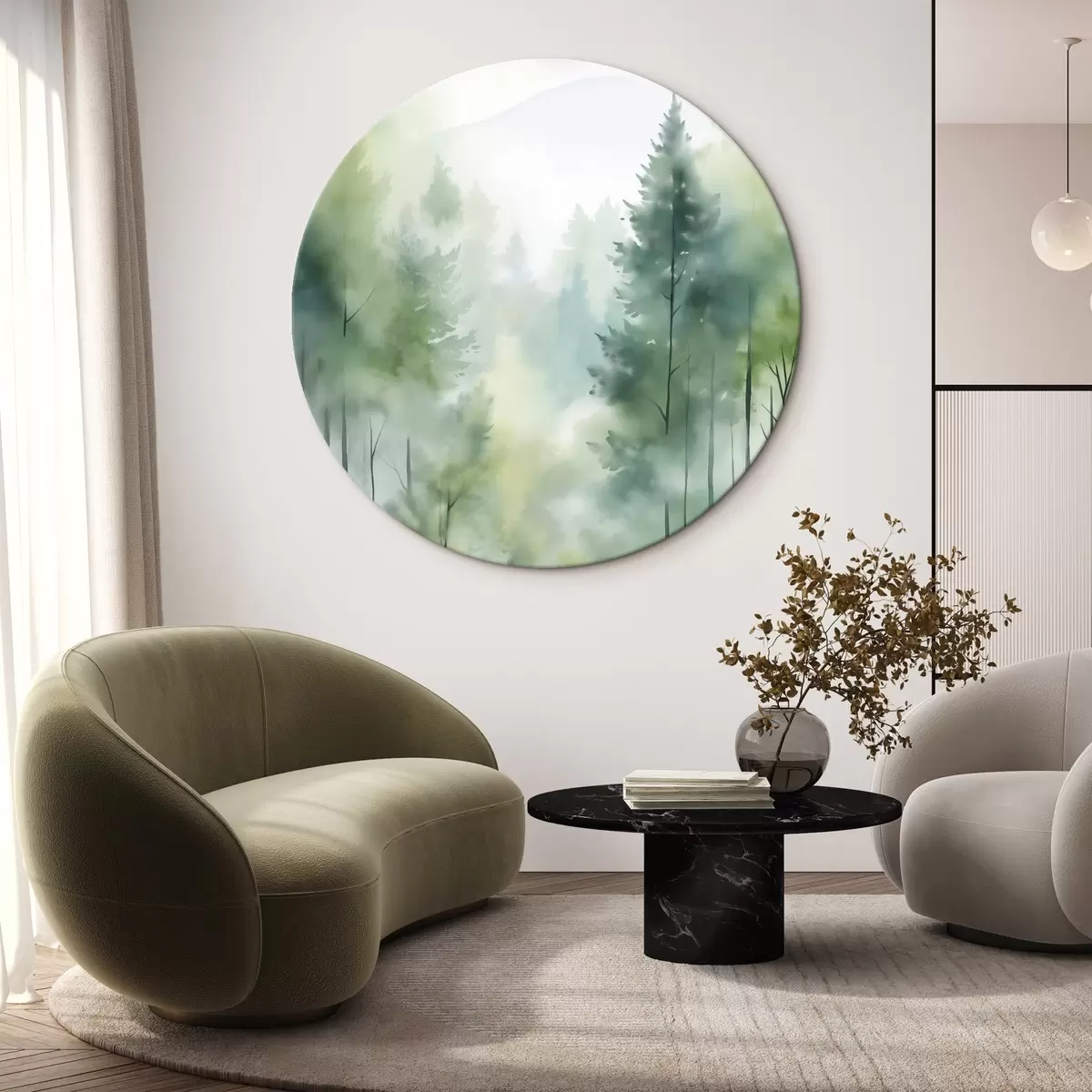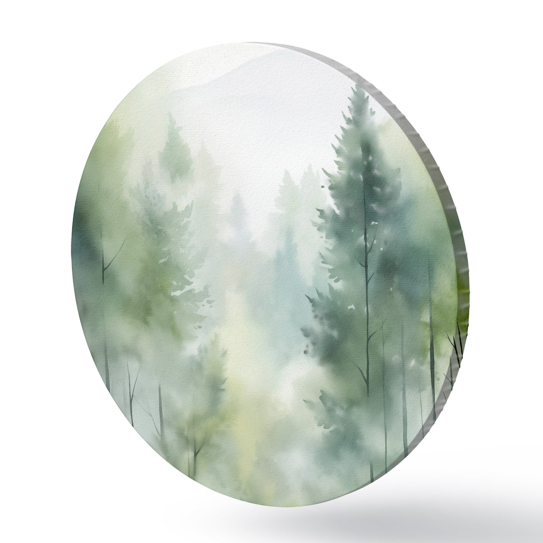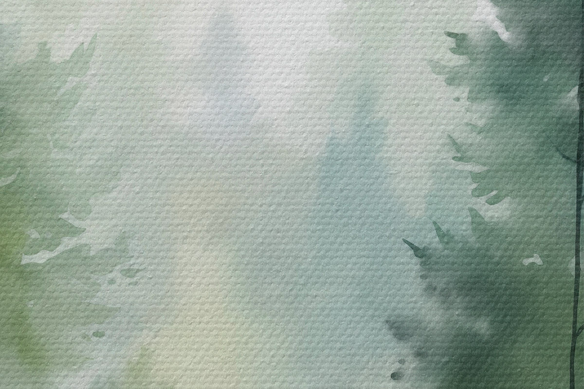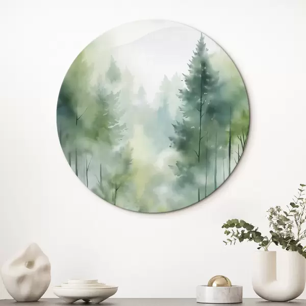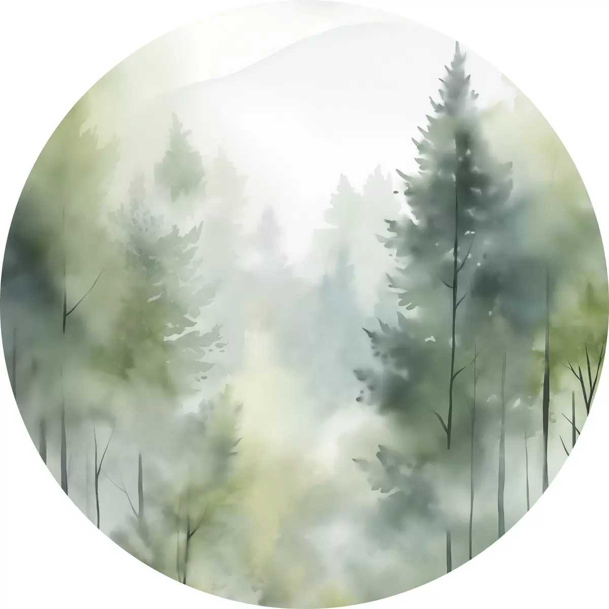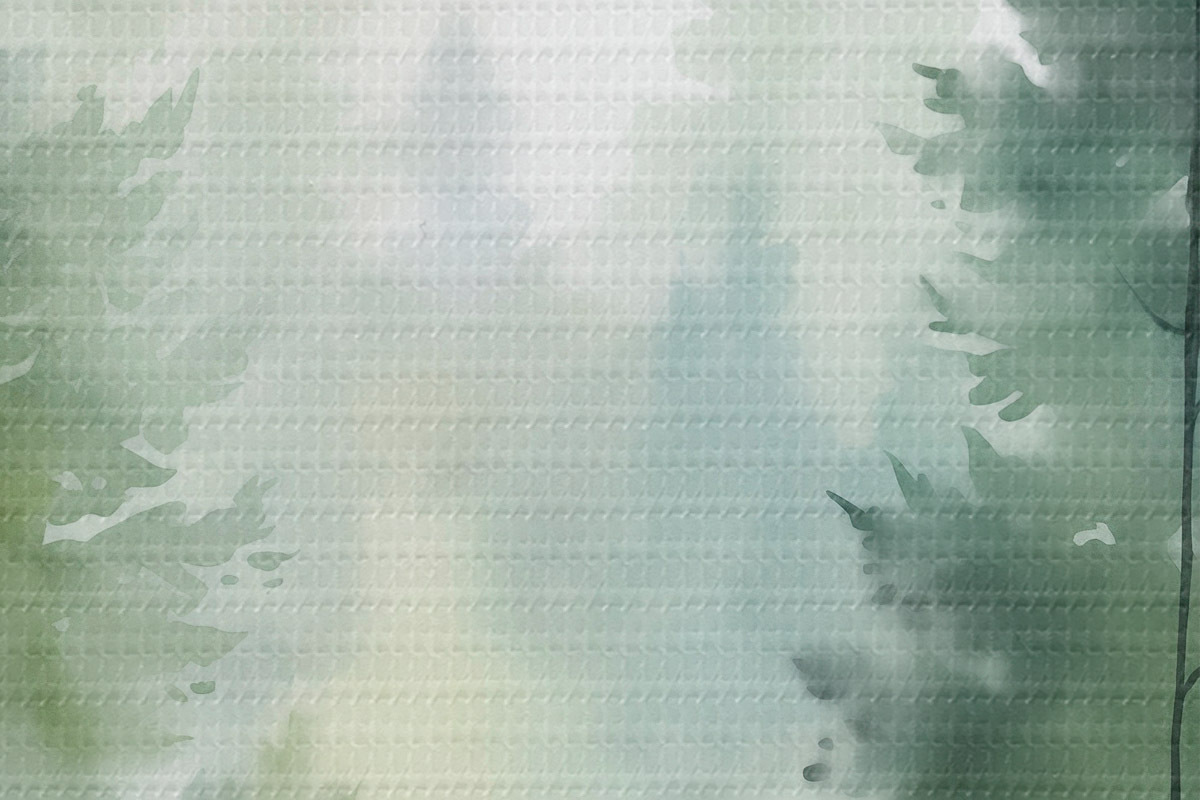 Obrázek Akvarelová malba napodobující zamlžený les s vysokými borovicemi a horami v pozadí Nr r46690
