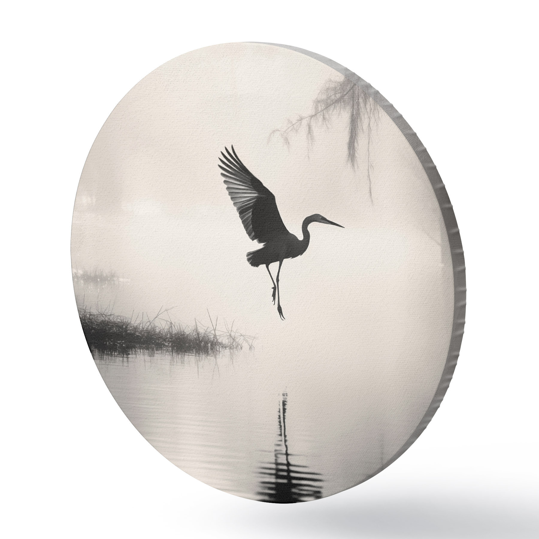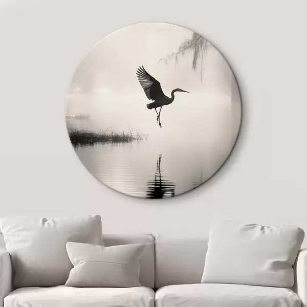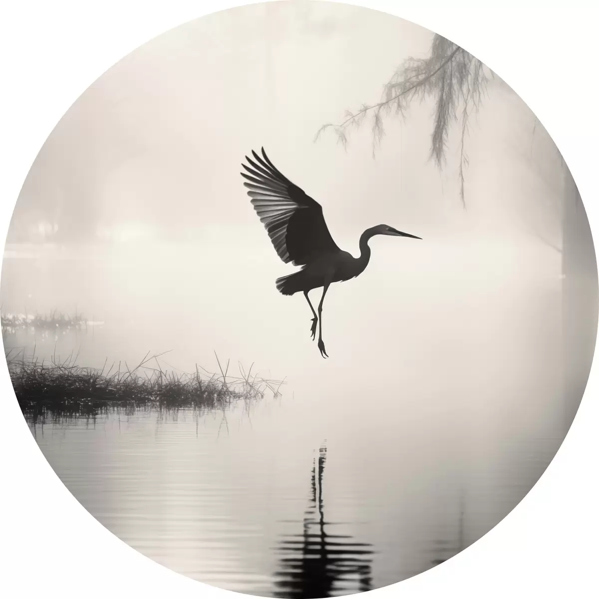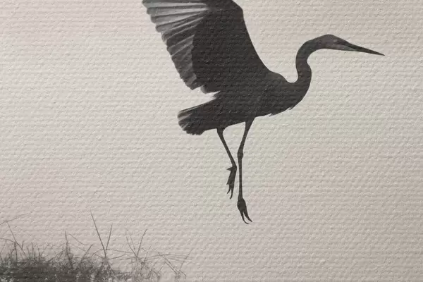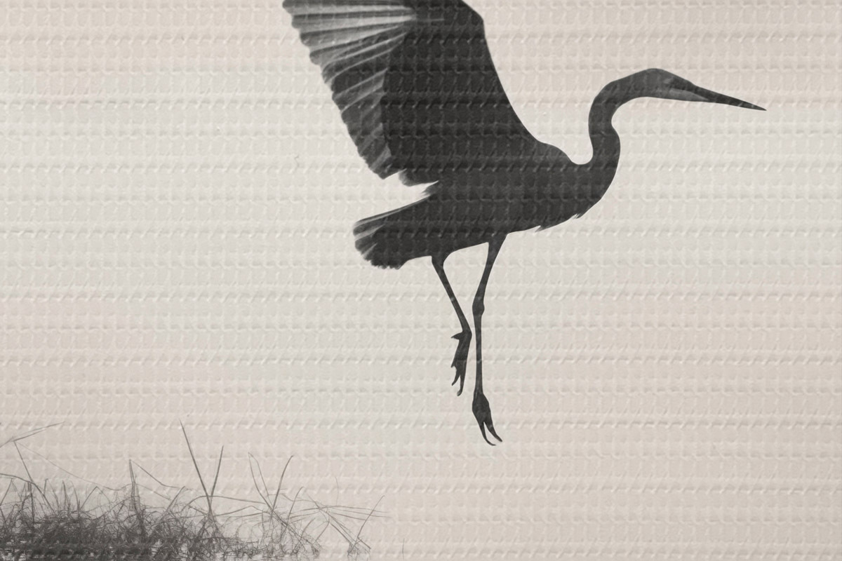 Obrázek Bílá volavka s roztaženými křídly, letící poblíž vysokého rákosí, černobílá minimalistická kompozice Nr r46694