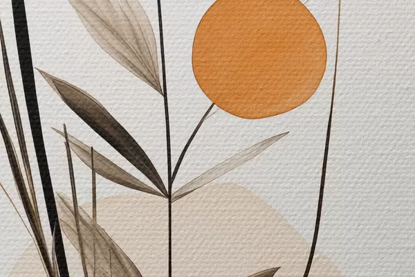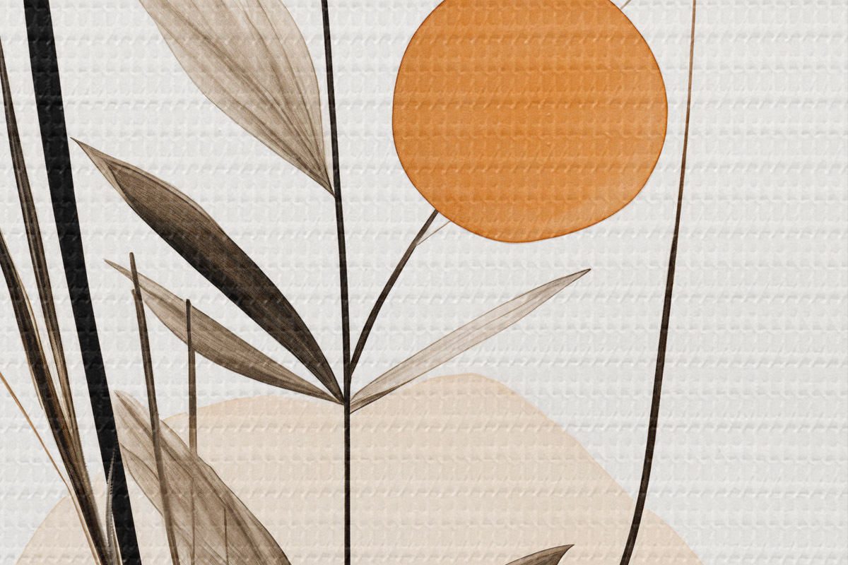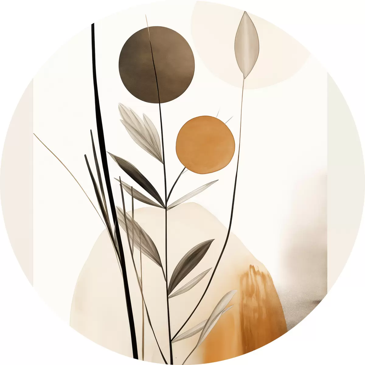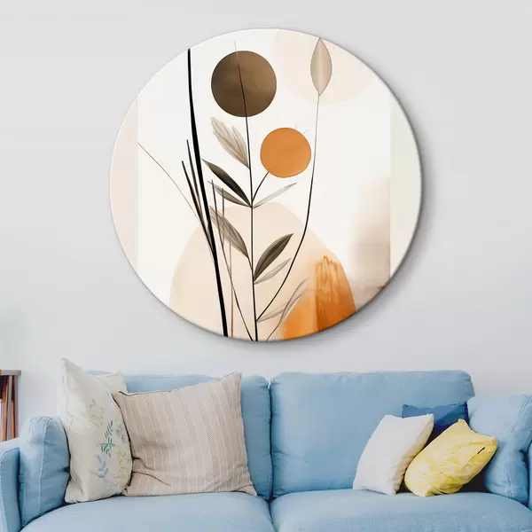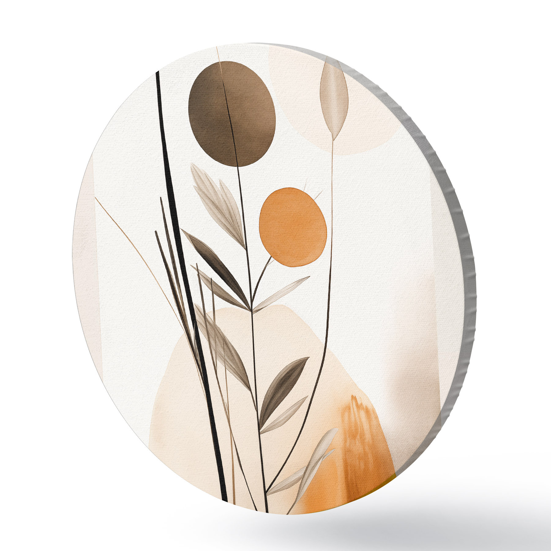 Obrázek Abstraktní malba s oranžovými a šedými kruhy, listy a větvemi, moderní styl, akvarelový efekt Nr r46698