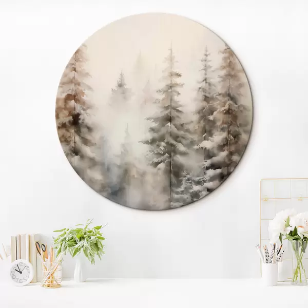 Obrázek Vysoké borovice pokryté sněhem, stojící v zamlženém lese, jemná, tlumená zimní scéna Nr r46701