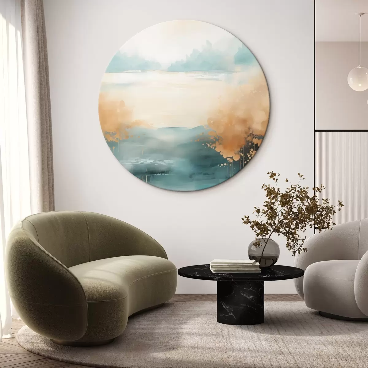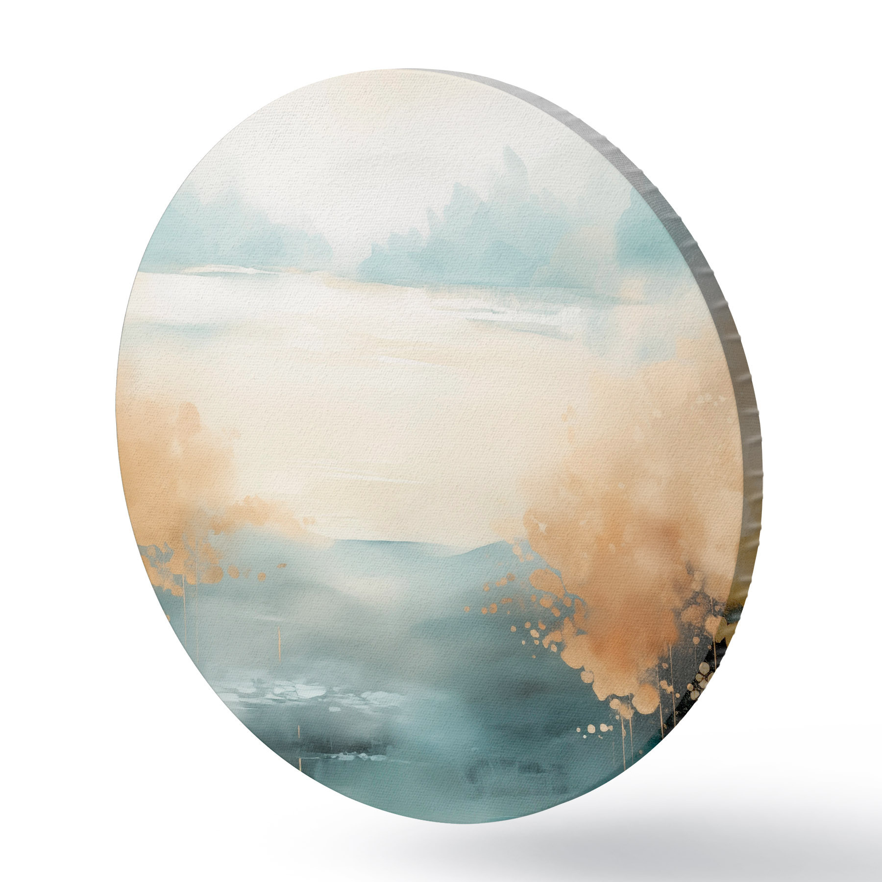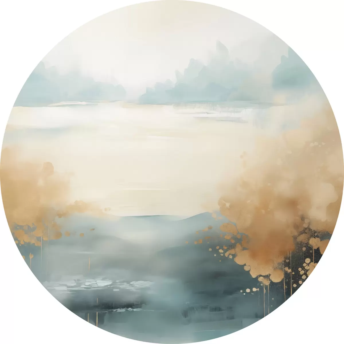 Obrázek Abstraktní krajina s horami a jezerem v modrozelené a žluté barvě s texturou, jemné tahy štětcem, minimalistické umělecké dílo Nr r46704