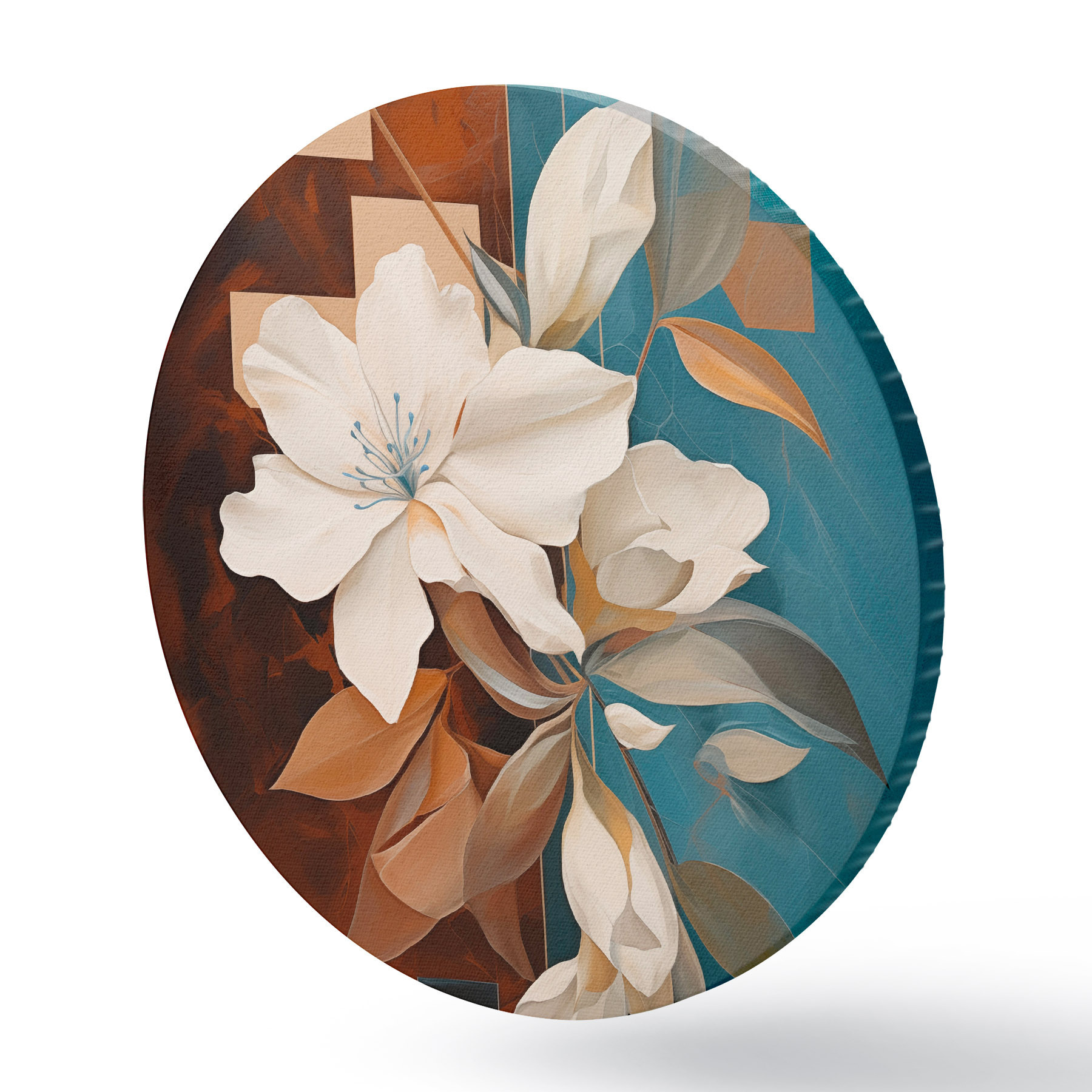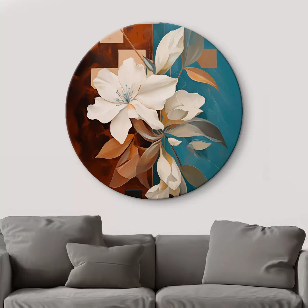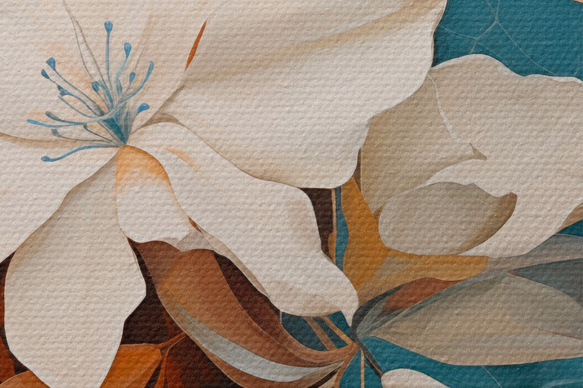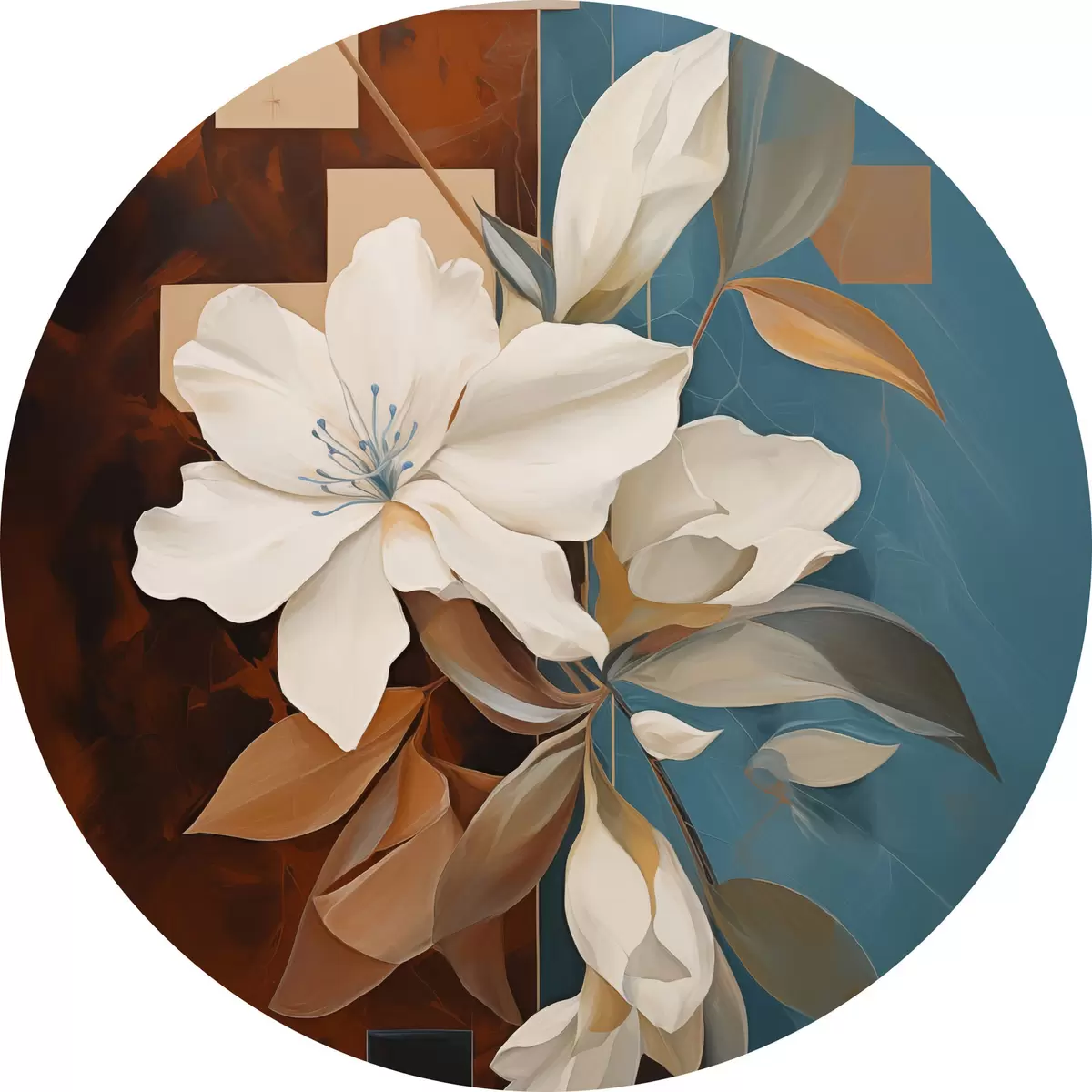 Obrázek Abstraktní bílé květy a listy na hnědém a modrém pozadí s abstraktními tvary, v minimalistickém stylu Nr r46709