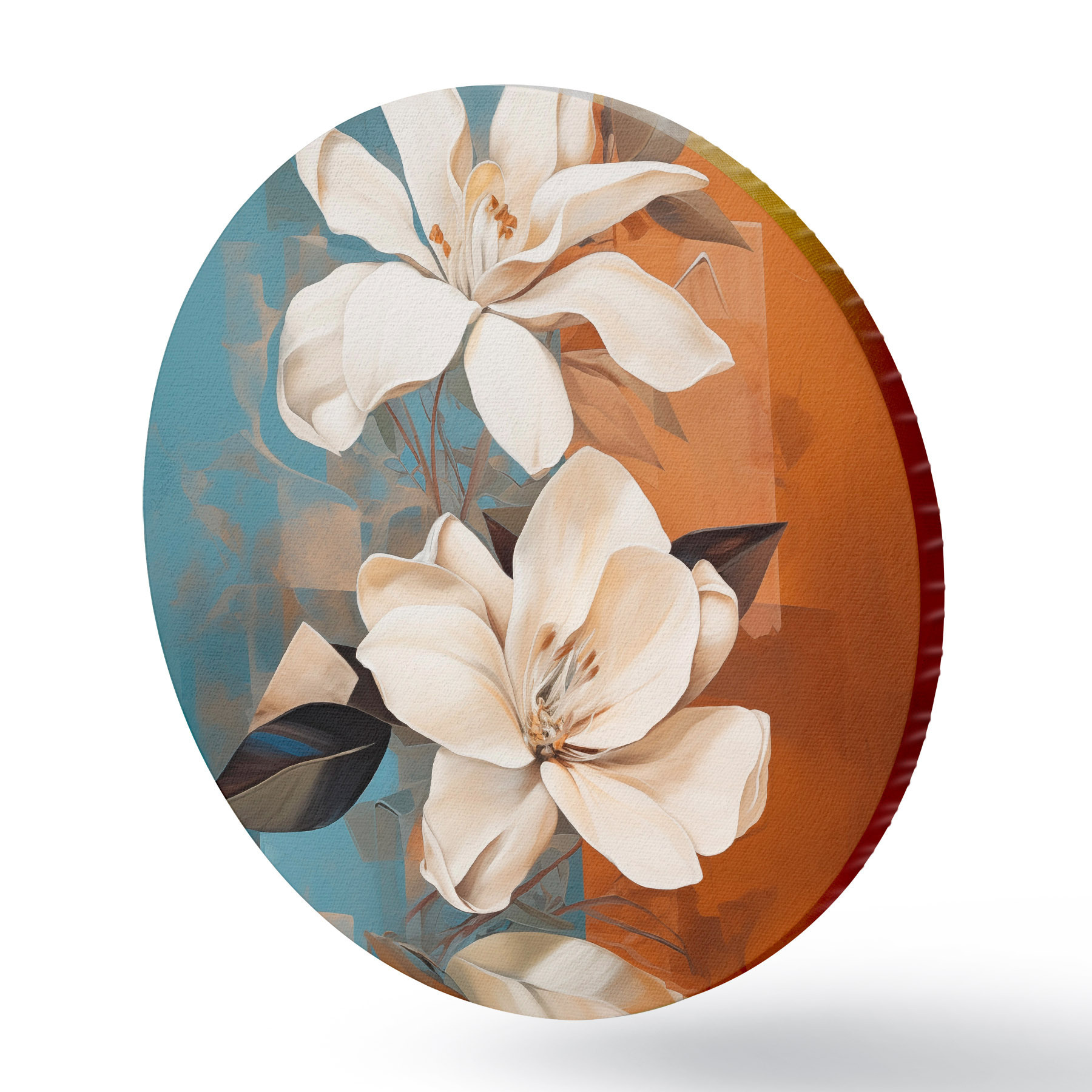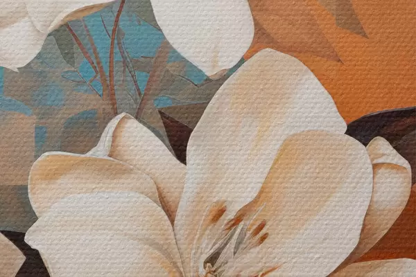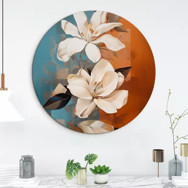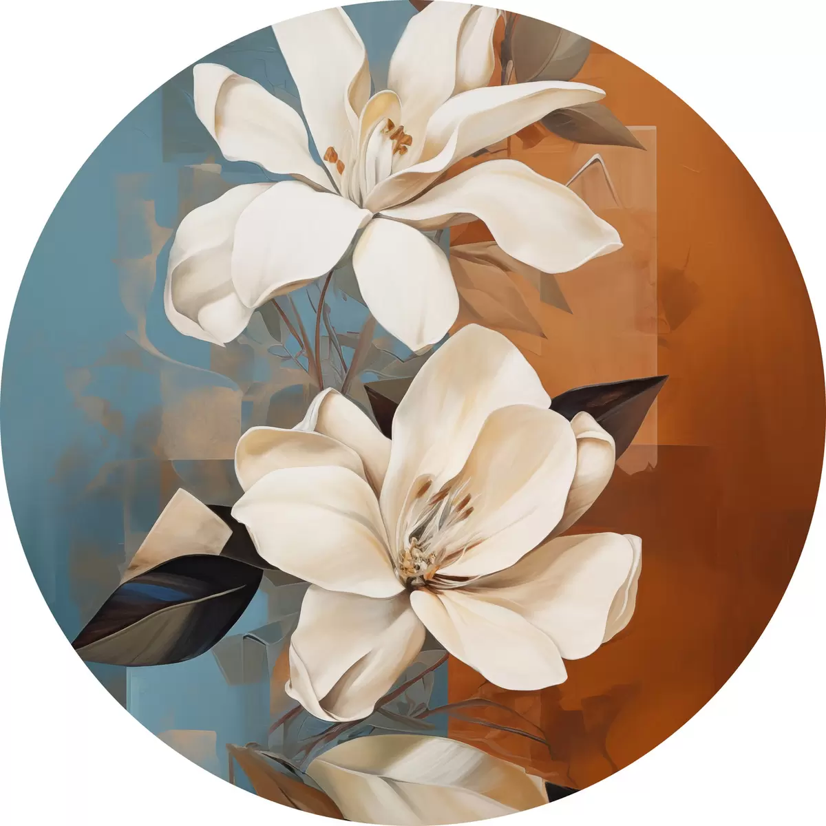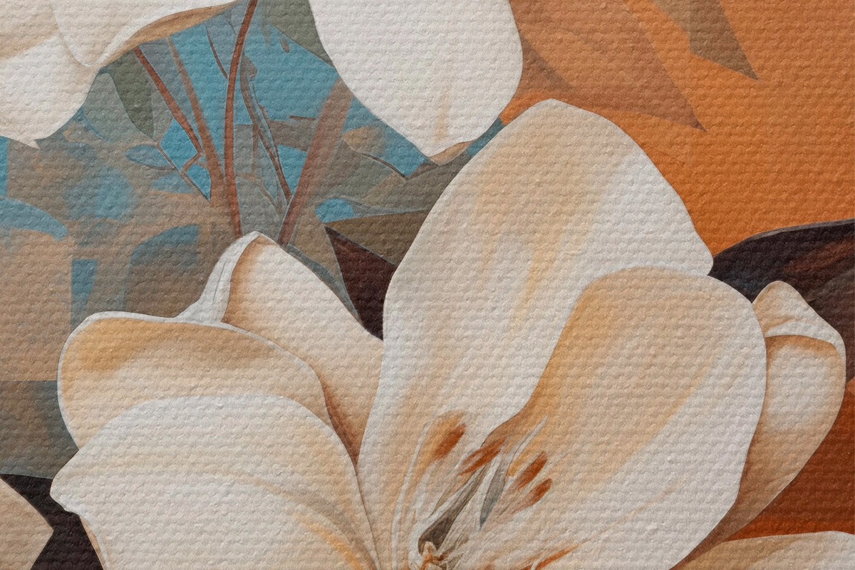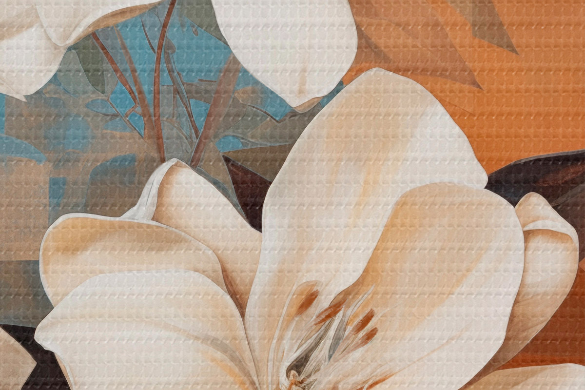 Obrázek Abstraktní bílé květy a listy na hnědém a modrém pozadí s abstraktními tvary, v minimalistickém stylu Nr r46710