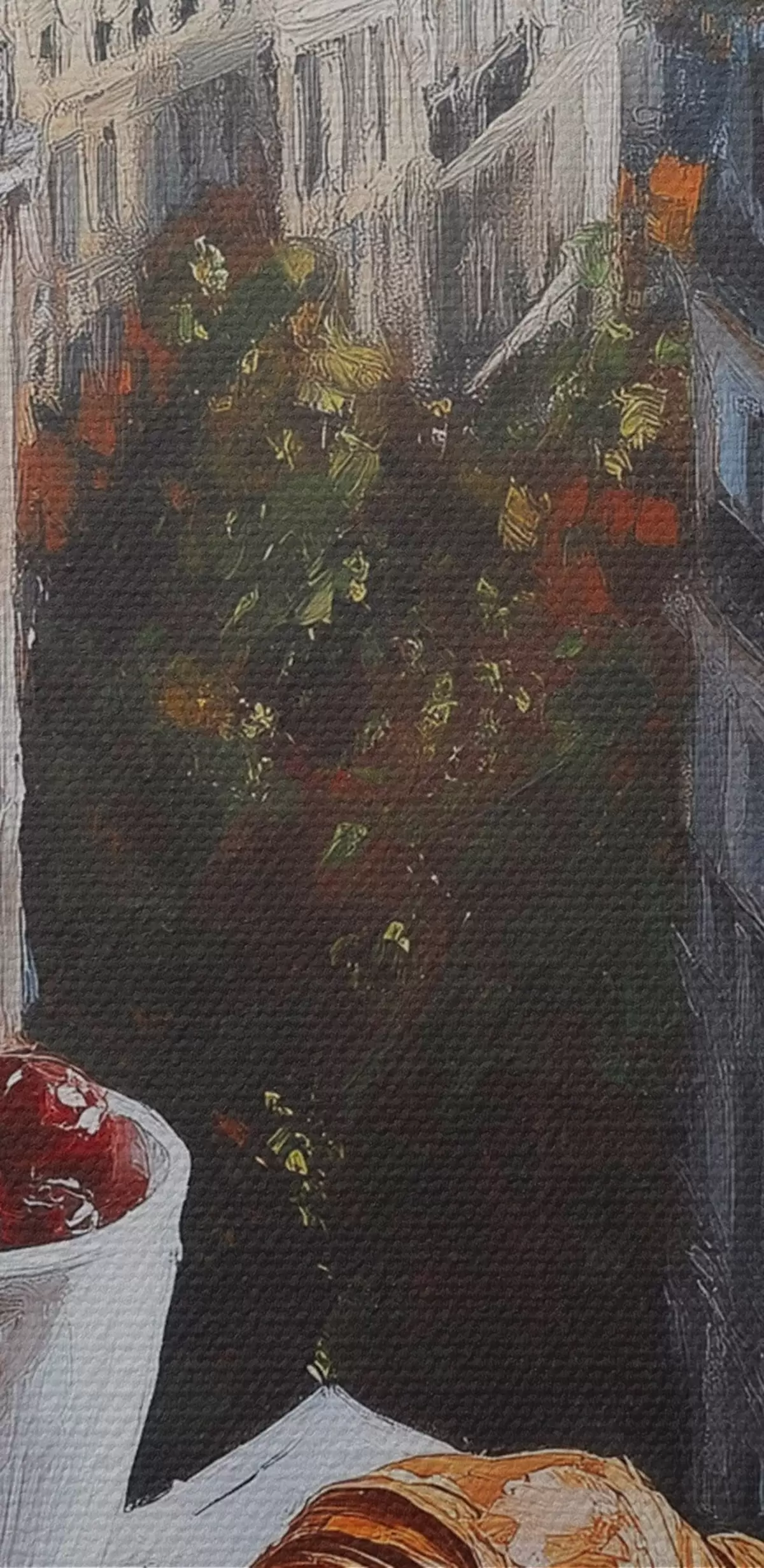 Obraz Pohled na město na balkoně v Paříži, Eiffelova věž, jahody, káva, deník Č. m00445