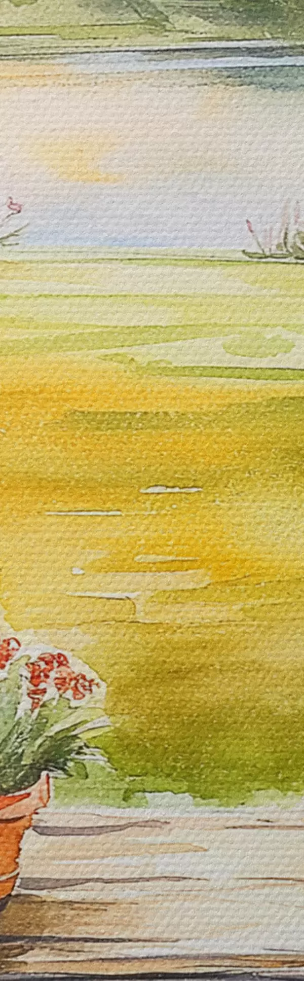 Obraz Letní vesnice, západ slunce, rustikální, květiny, jezero, akvarelový styl Č. m00449