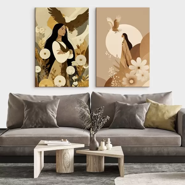 Obraz Ženy s létajícími orly, kmenový styl, béžové barvy Č. m00477