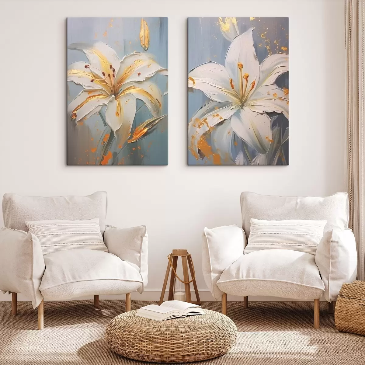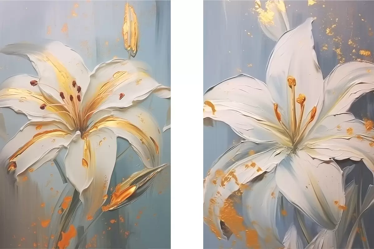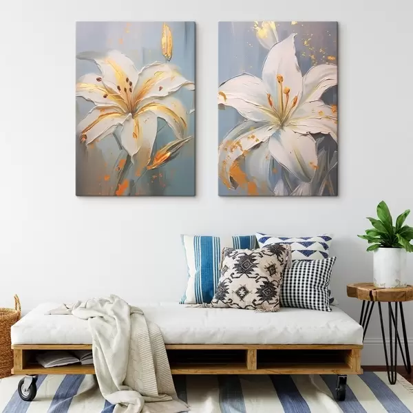 Obraz Bílé lilie se žlutými tahy na modrém pozadí Č. m00497