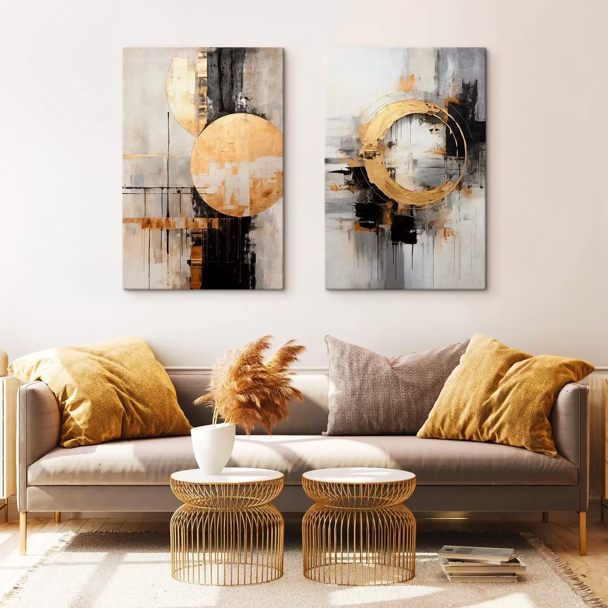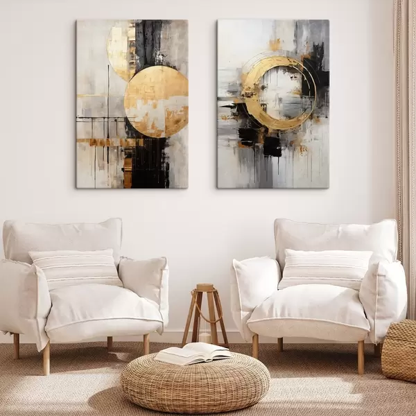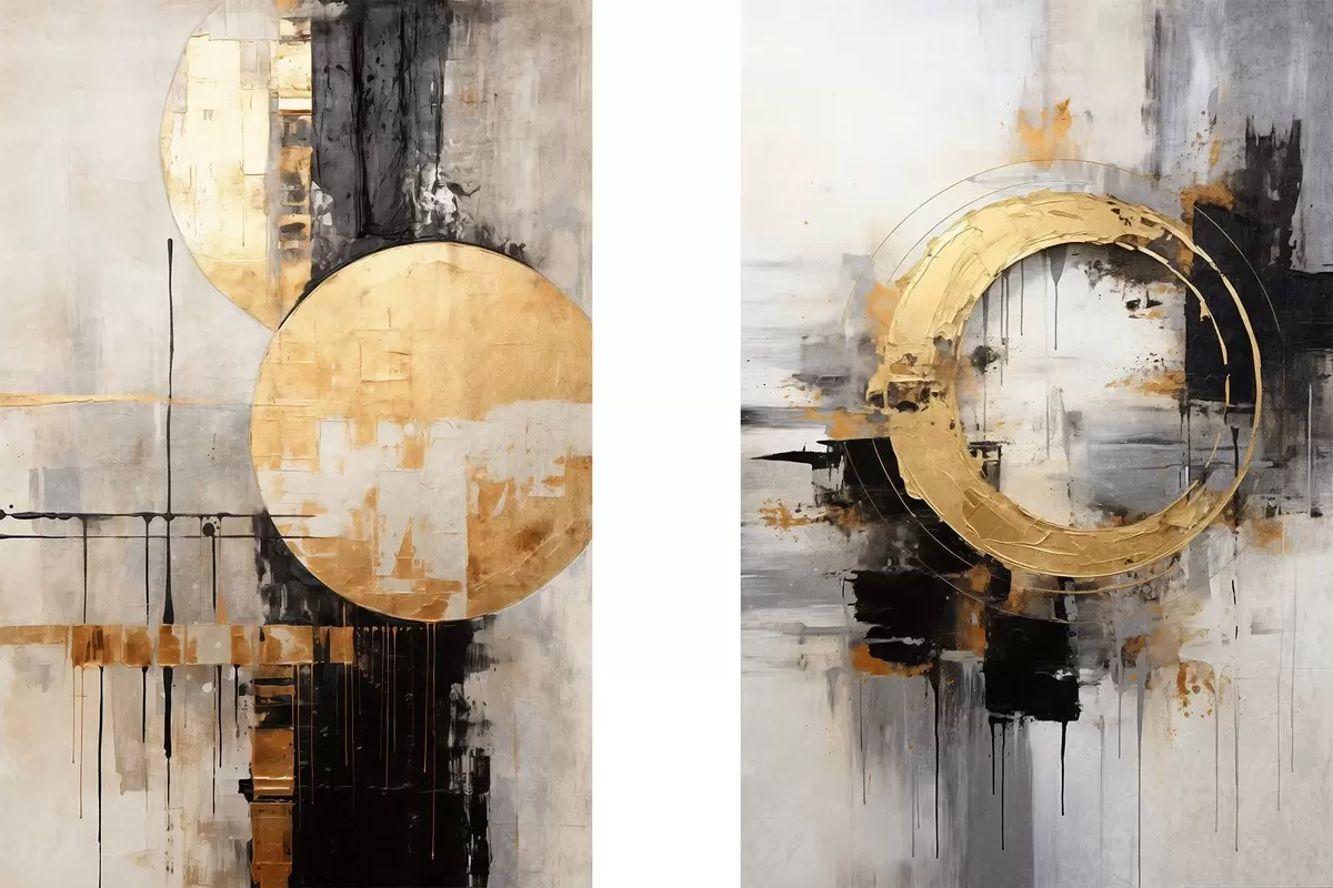 Obraz Abstraktní malba s kruhy, černými a žlutými liniemi a pozadím v šedých a bílých tónech Č. m00527