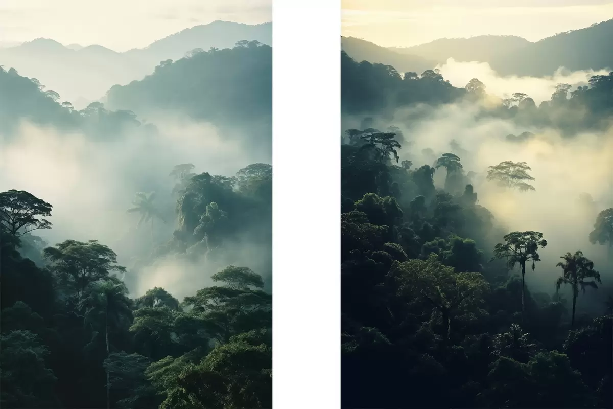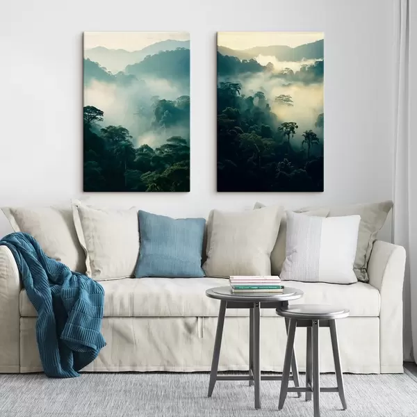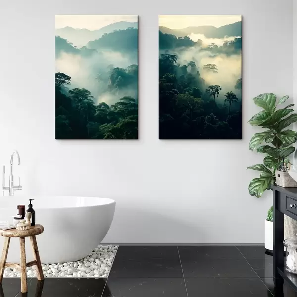 Obraz Tropický deštný prales se svěžími zelenými stromy a hustou vrstvou mlhy, která vytváří atmosférické prostředí Č. m00529