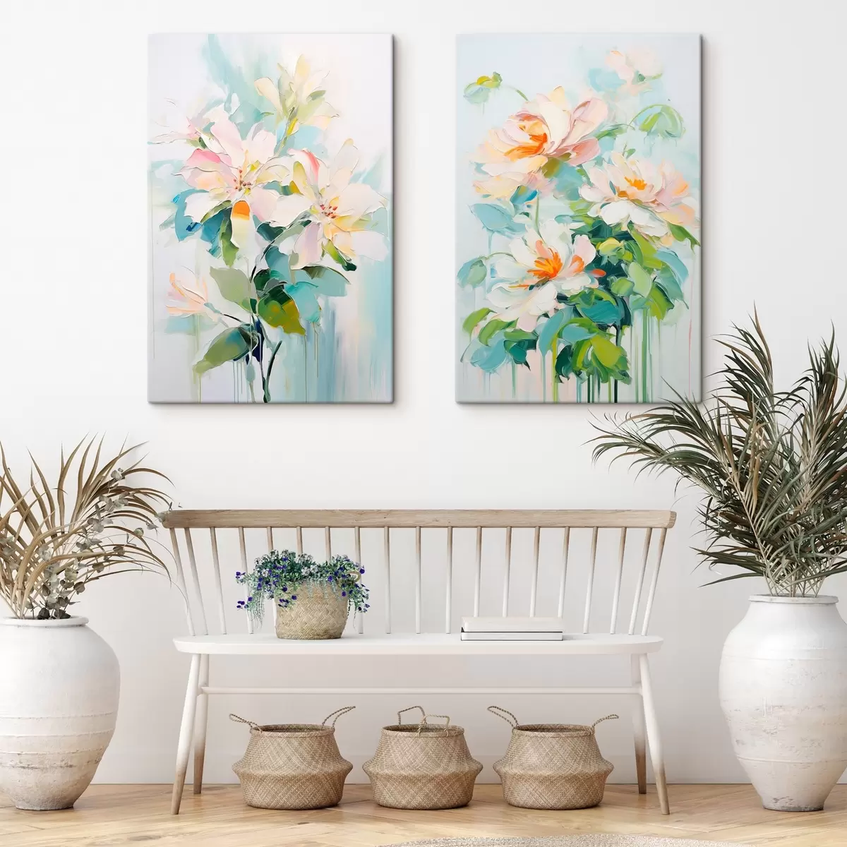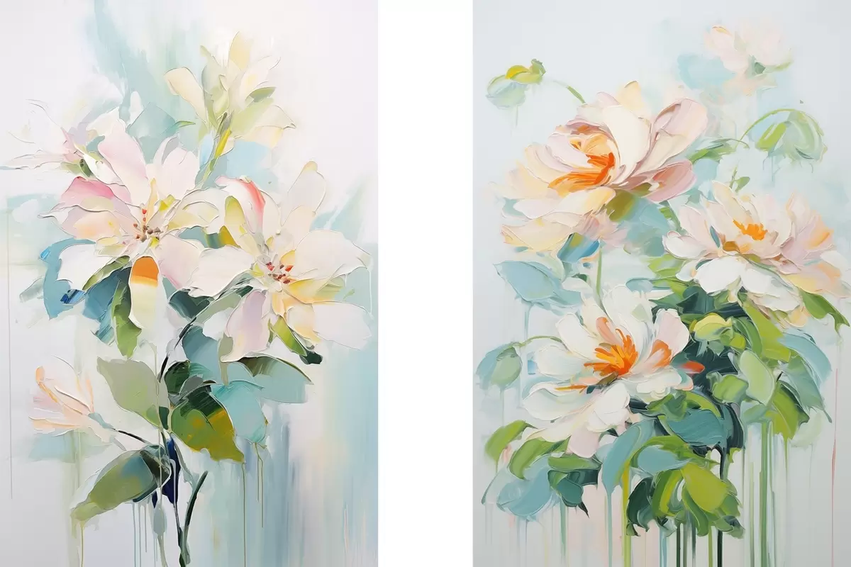 Obraz Bílé a pastelové broskvové květy, zelené listy, jemné tahy štětcem imitace olejomalby, světle modré pozadí Č. m00644