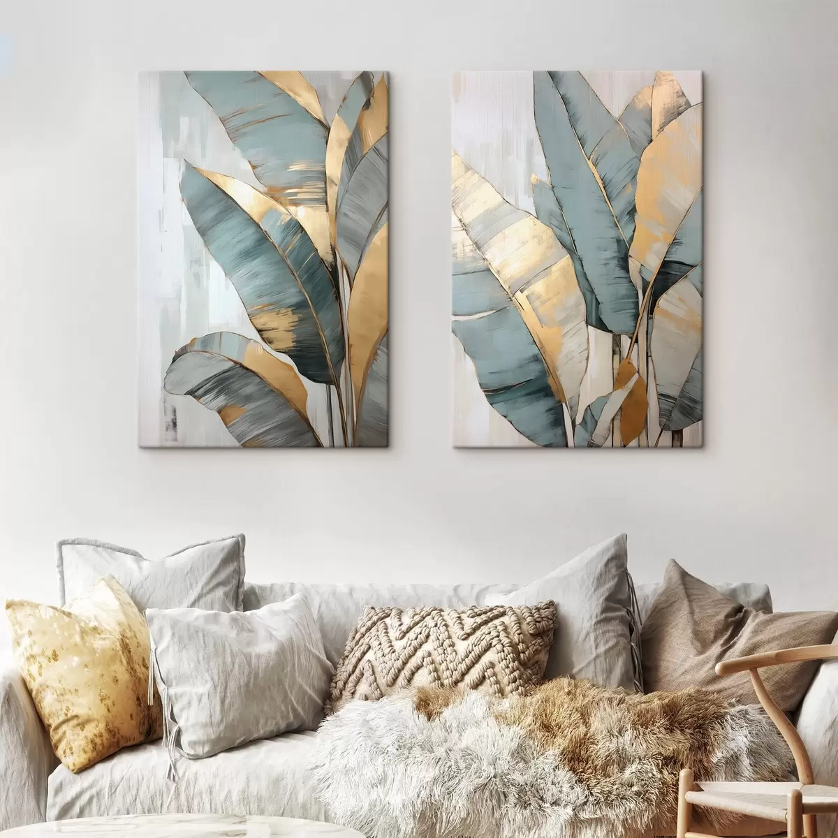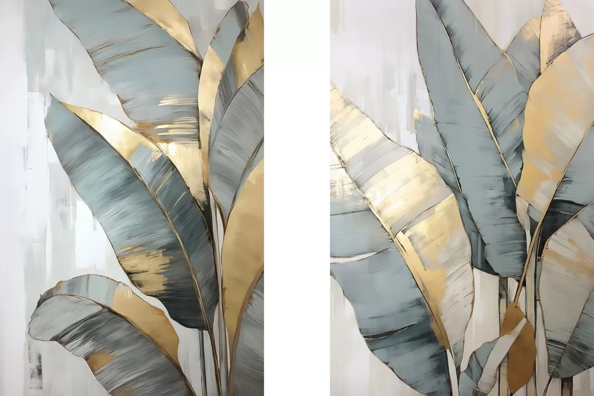 Obraz Sada tlumených modrých, šedých a žlutých banánových listů s viditelnými tahy štětce na bílém abstraktním pozadí Č. m00645