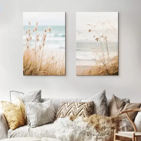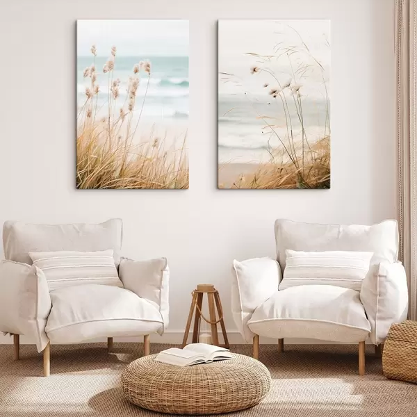 Obraz Vysoká tráva s nadýchanými semínky, písečná pláž a vlny oceánu v pozadí, jemná a tlumená paleta barev Č. m00650