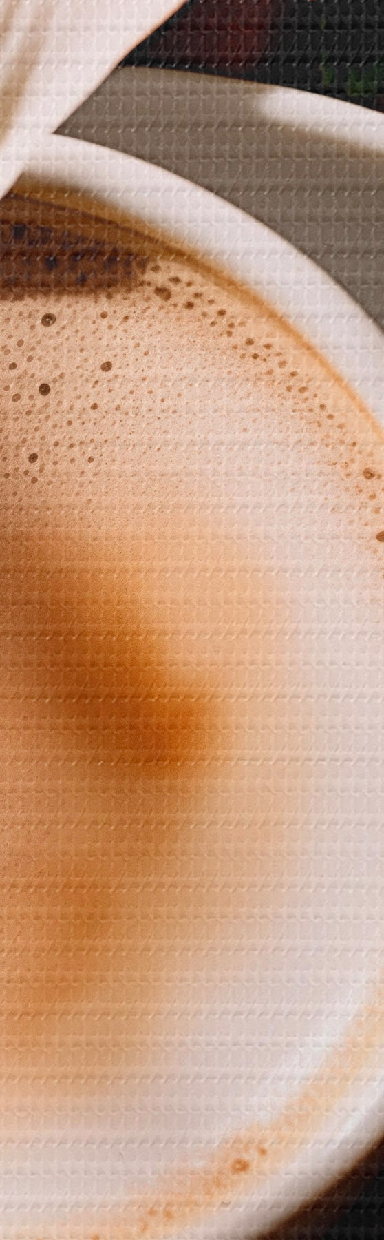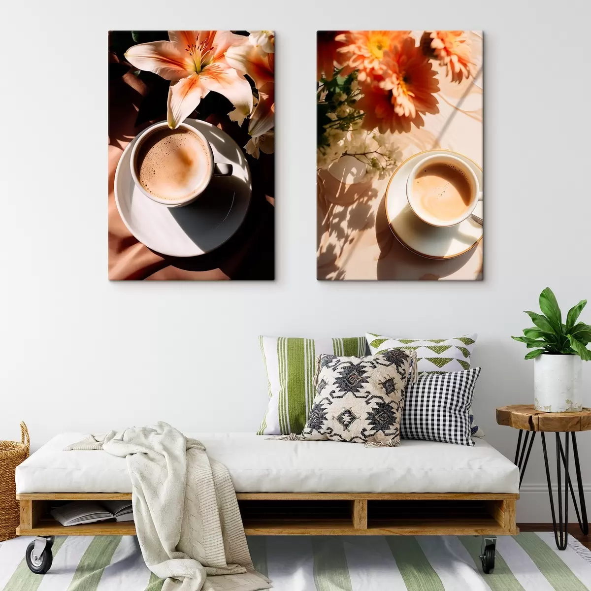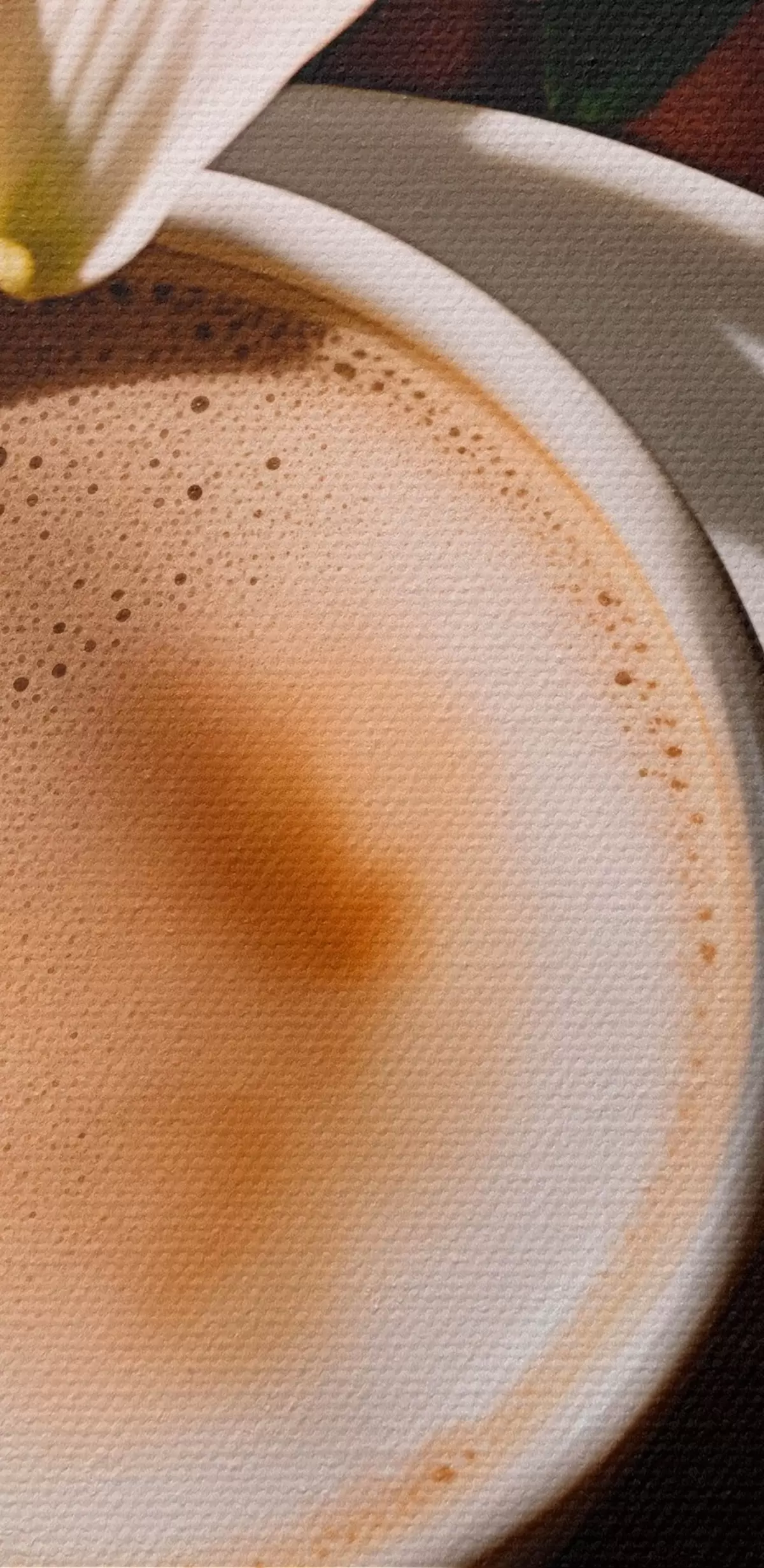 Obraz Šálek kávy s pěnou na bílém talíři, květiny v pozadí, sluneční světlo Č. m00654