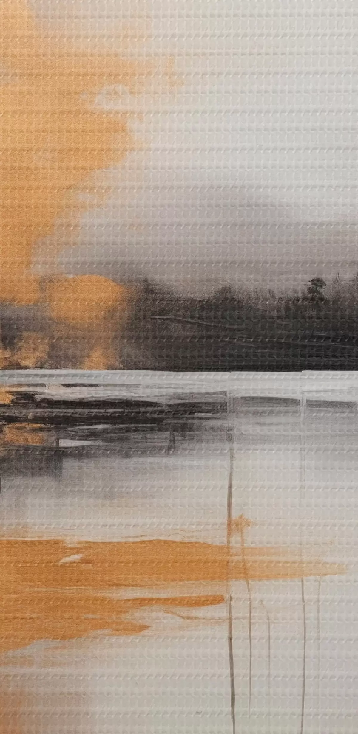 Obraz Abstraktní krajina s jezerem, stromem a žlutou mlhou , ve které se odráží voda a zatažená obloha Č. m00657