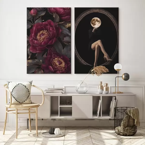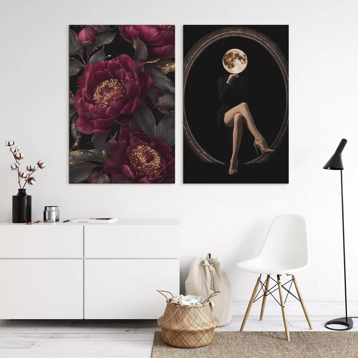 Obraz Burgundské pivoňky a silueta s měsíční hlavou na černém pozadí Č. m00765
