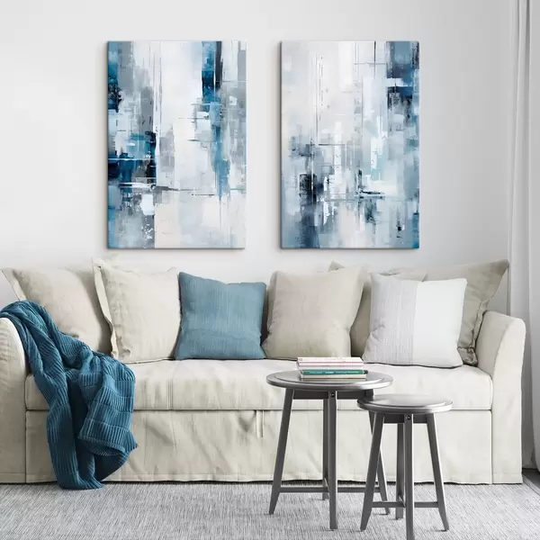 Obraz Abstraktní malba imitující modrou, šedou a bílou barvu, svislé čáry a geometrické tvary Č. m00819